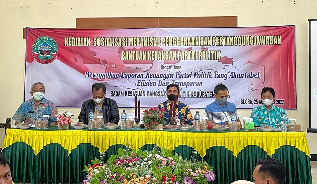 Kegiatan yang mengusung tema "Mewujudkan Laporan Keuangan Partai Politik yang Akuntabel, Efisien, dan Transparan" ini dibuka oleh Agus Puji Mulyono selaku Kepala KESBANGPOL Kabupaten Blora. Ia juga menyampikan bahwa narasumber kegiatan berasal dari KPP Pratama Blora, Badan Pendapatan Pengelolaan Keuangan dan Aset Daerah (BPPKAD) Blora, dan Badan Pemeriksa Keuangan Jawa Tengah.