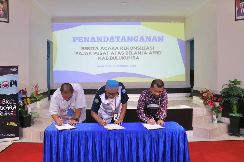 Penandatanganan Berita Acara Rekonsiliasi Pajak Pusat atas Belanja APBD Kabupaten Bulukumba dihadiri langsung oleh Kepala KPP Pratama Bulukumba Mulyana, Kepala KPPN Bantaeng Poerfika Agus Bachtiar, dan Kepala BPKPD Kabupaten Bulukumba Andi Sufardiman.