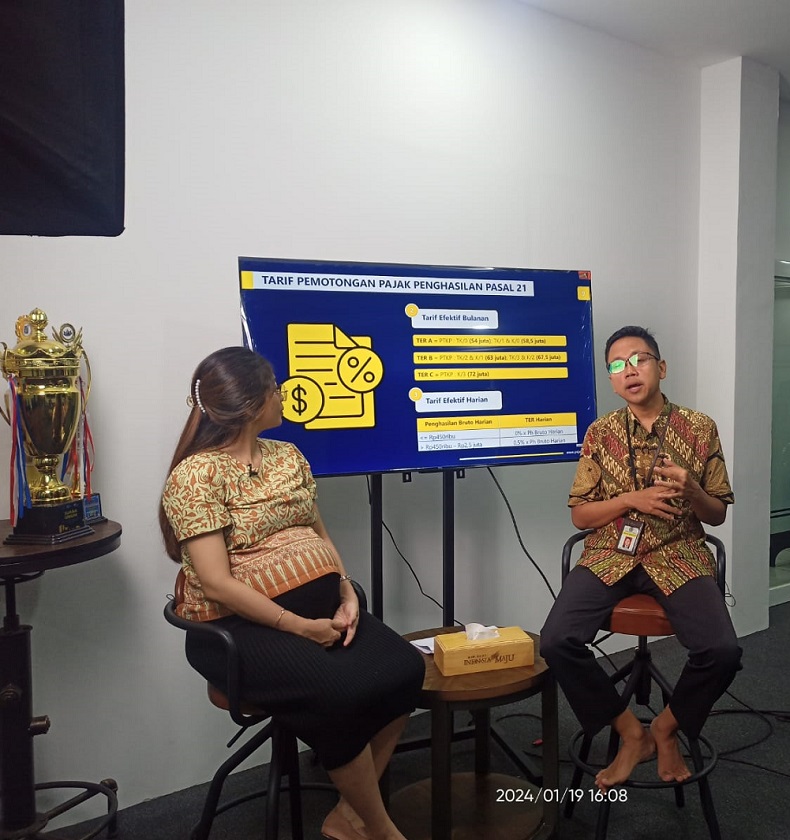 Tim Penyuluh Kantor Pelayanan Pajak (KPP) Pratama Semarang Candisari edukasi secara online terkait Peraturan Pemerintah (PP) Nomor 58 Tahun 2023 tentang Tarif Pemotongan Pajak Penghasilan (PPh) Pasal 21 atas Penghasilan Sehubungan Pekerjaan, Jasa, atau Kegiatan Wajib Pajak Orang Pribadi melalui Live Instagram (IG) pukul 16.00 hingga selesai (Jumat, 19/1).