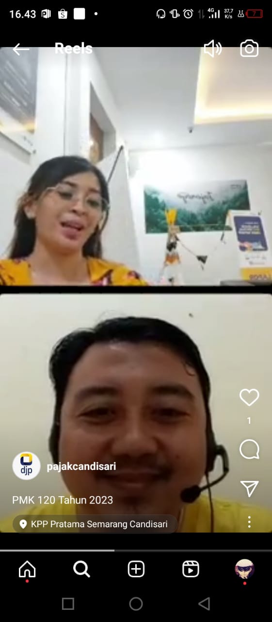 KPP Pratama Semarang Candisari menyelenggarakan kegiatan edukasi melalui akun media sosial Instagram KPP Pratama Semarang Candisari secara langsung (IG Live) dengan tema PMK nomor 120 Tahun 2023 di Ruang Penyuluhan KPP Pratama Semarang Candisari. (Selasa,12/12)
