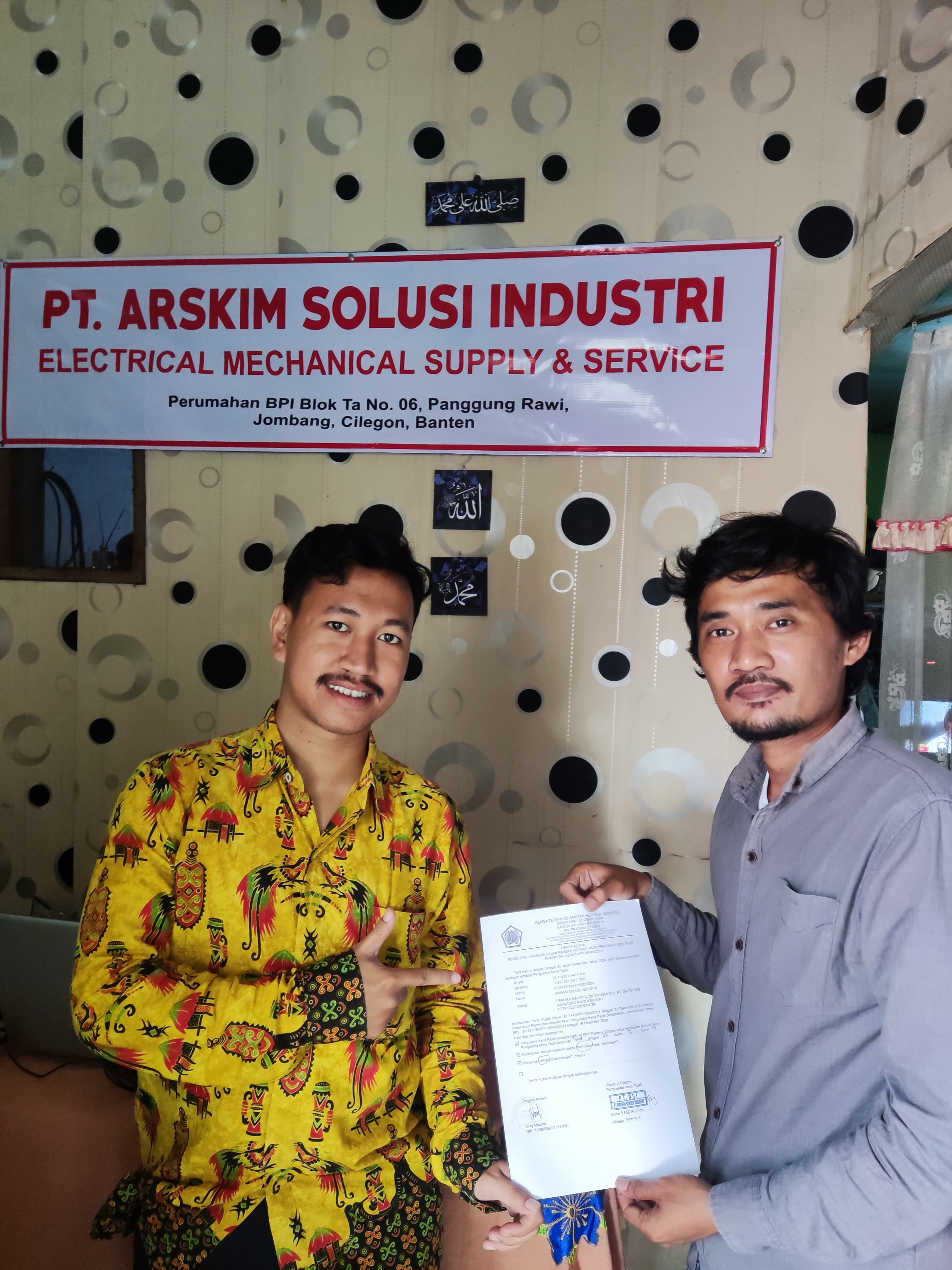 Tim penelitian lapangan Kantor Pelayanan Pajak (KPP) Pratama Cilegon yang terdiri dari Fahminuddin Alfaruq dan Ordy Maulino melakukan kunjungan langsung ke lokasi kegiatan usaha PT ASI di Kelurahan Panggung Rawi, Kecamatan Jombang, Kota Cilegon, Banten (Selasa, 24/12). Permohonan Aktivasi Akun Pengusaha Kena Pajak ini sebelumnya diajukan oleh PT ASI pada tanggal 18 Desember 2024.