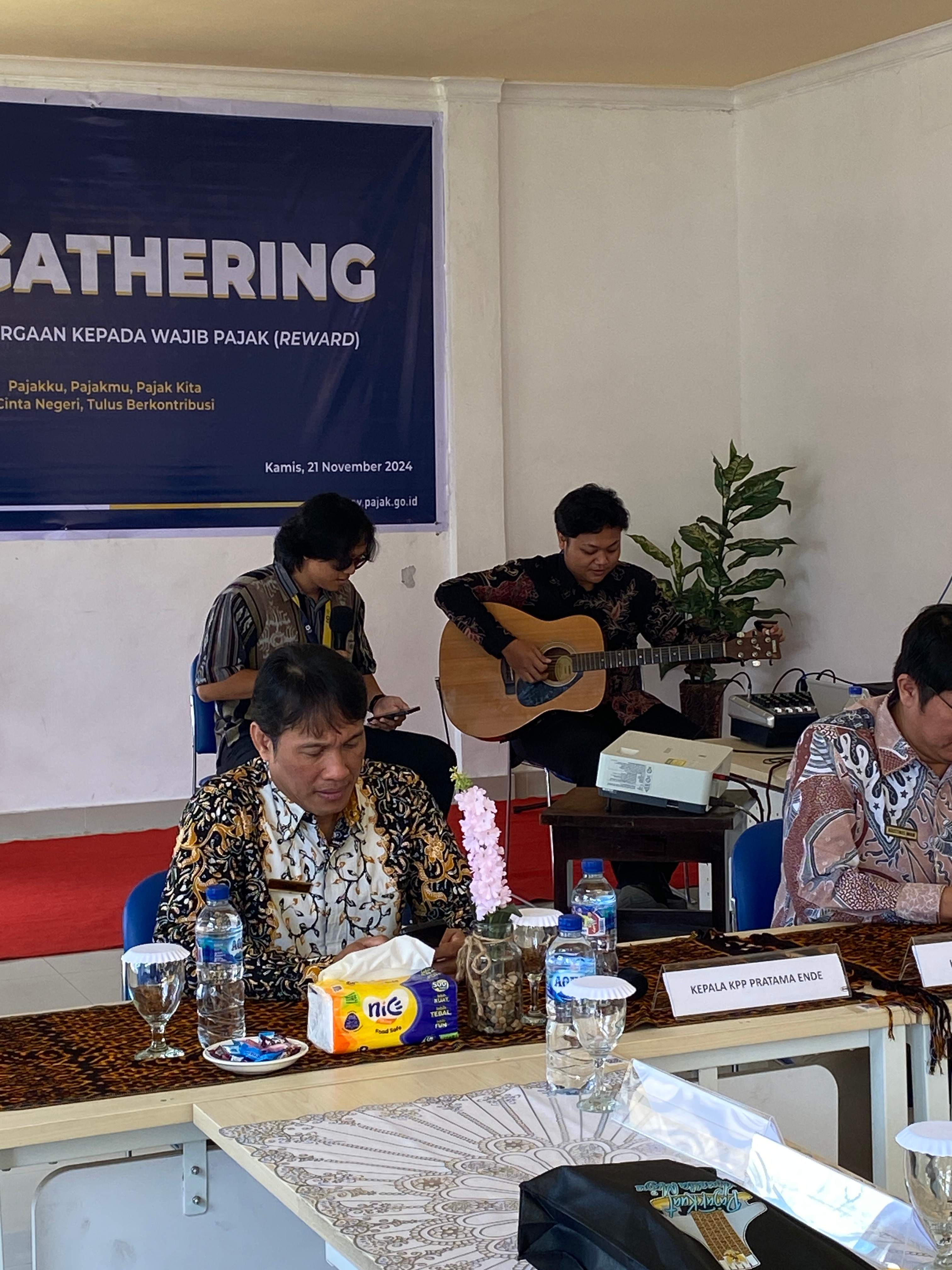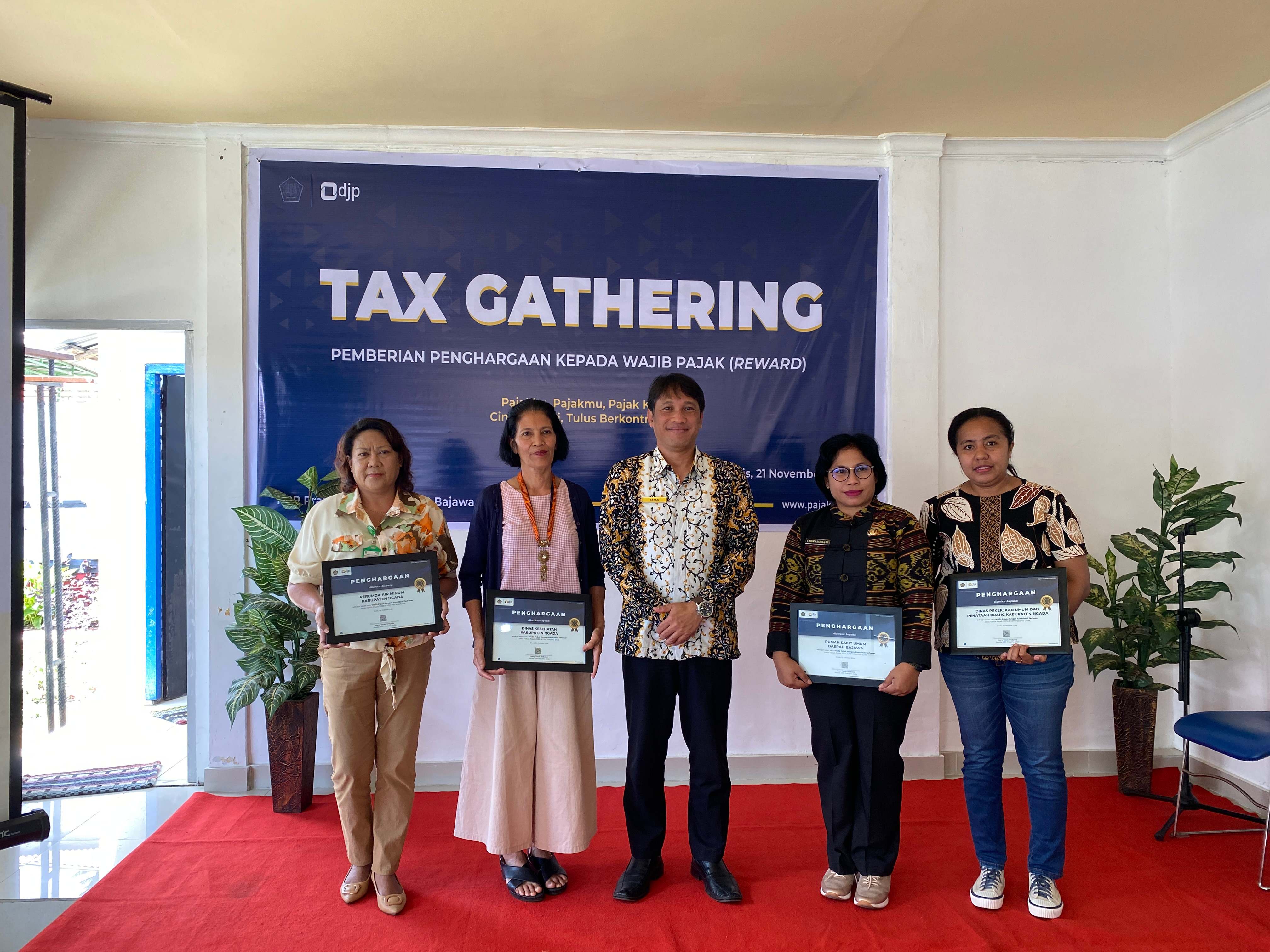 Kantor Pelayanan Pajak (KPP) Pratama Ende bersama Kantor Pelayanan, Penyuluhan, dan Konsultasi Perpajakan (KP2KP) Bajawa menyelenggarakan kegiatan Tax Gathering. Bertempat di Aula KP2KP Bajawa, kegiatan ini bertujuan untuk meningkatkan sinergi antara Direktorat Jenderal Pajak (DJP) dengan wajib pajak serta memberikan penghargaan kepada wajib pajak yang berkontribusi besar terhadap penerimaan pajak tahun 2023 (Kamis, 21 /11).