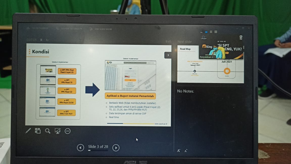 Materi berikutnya dibawakan oleh Wiwik Wasiati, Fungsional Penyuluh Pajak Muda. Wiwik menjelaskan mengenai penggunaan aplikasi e-bupot serta tata cara melaporkan bukti potong dengan SPT Masa 21/26.