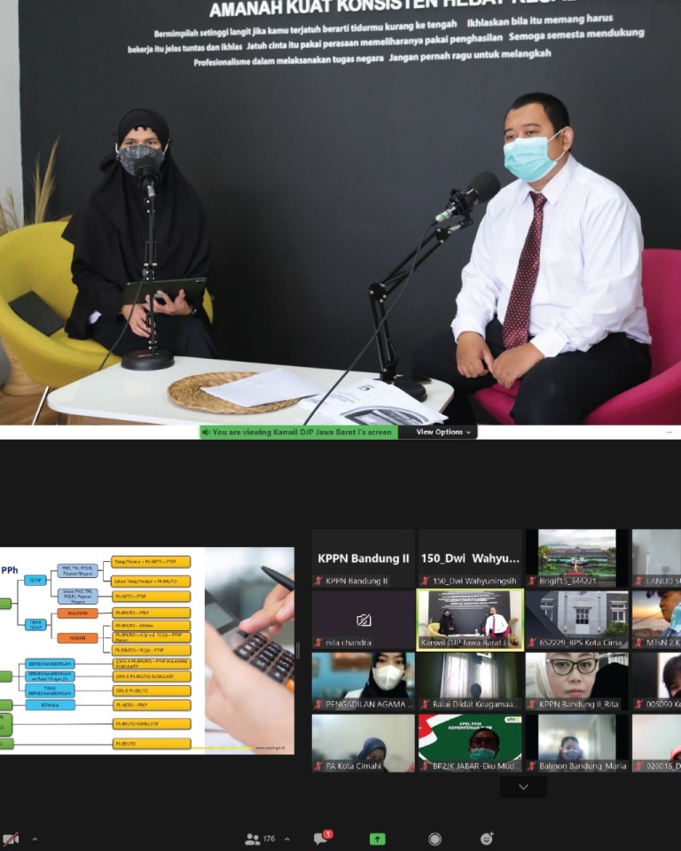 Sebanyak 170 satuan kerja (satker) instansi pemerintah yang berada di wilayah pembayaran Kantor Pelayanan Perbendaharaan Negara (KPPN) Bandung II mengikuti sosialisasi secara daring melalui aplikasi Zoom Meeting yang terselenggara berkat kolaborasi Kantor Wilayah (Kanwil) DJP Jawa Barat I dan KPPN Bandung 2, di Gedung keuangan Negara, Jalan Asia Afrika nomor 114 Kota Bandung (Senin, 1/11).