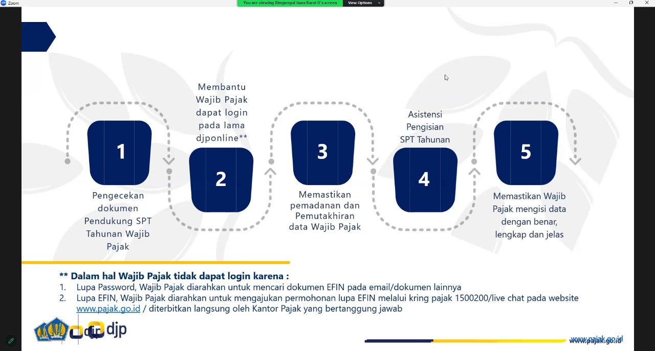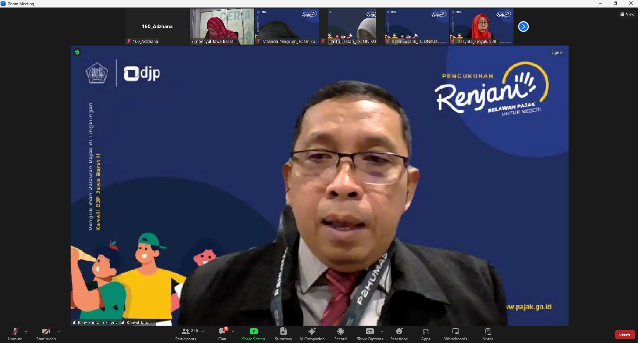 Kantor Wilayah Direktorat Jenderal Pajak (Kanwil DJP) Jawa Barat II melaksanakan kegiatan Pengukuhan dan Pembekalan untuk 295 Relawan Pajak pada hari Selasa(30/01). Kegiatan Pengukuhan dan Pembekalan tersebut dilaksanakan secara daring melalui aplikasi Zoom Meeting yang dihadiri oleh seluruh Relawan Pajak dan Perwakilan dari Kantor Pelayanan Pajak di Lingkungan Kanwil DJP Jawa Barat II.