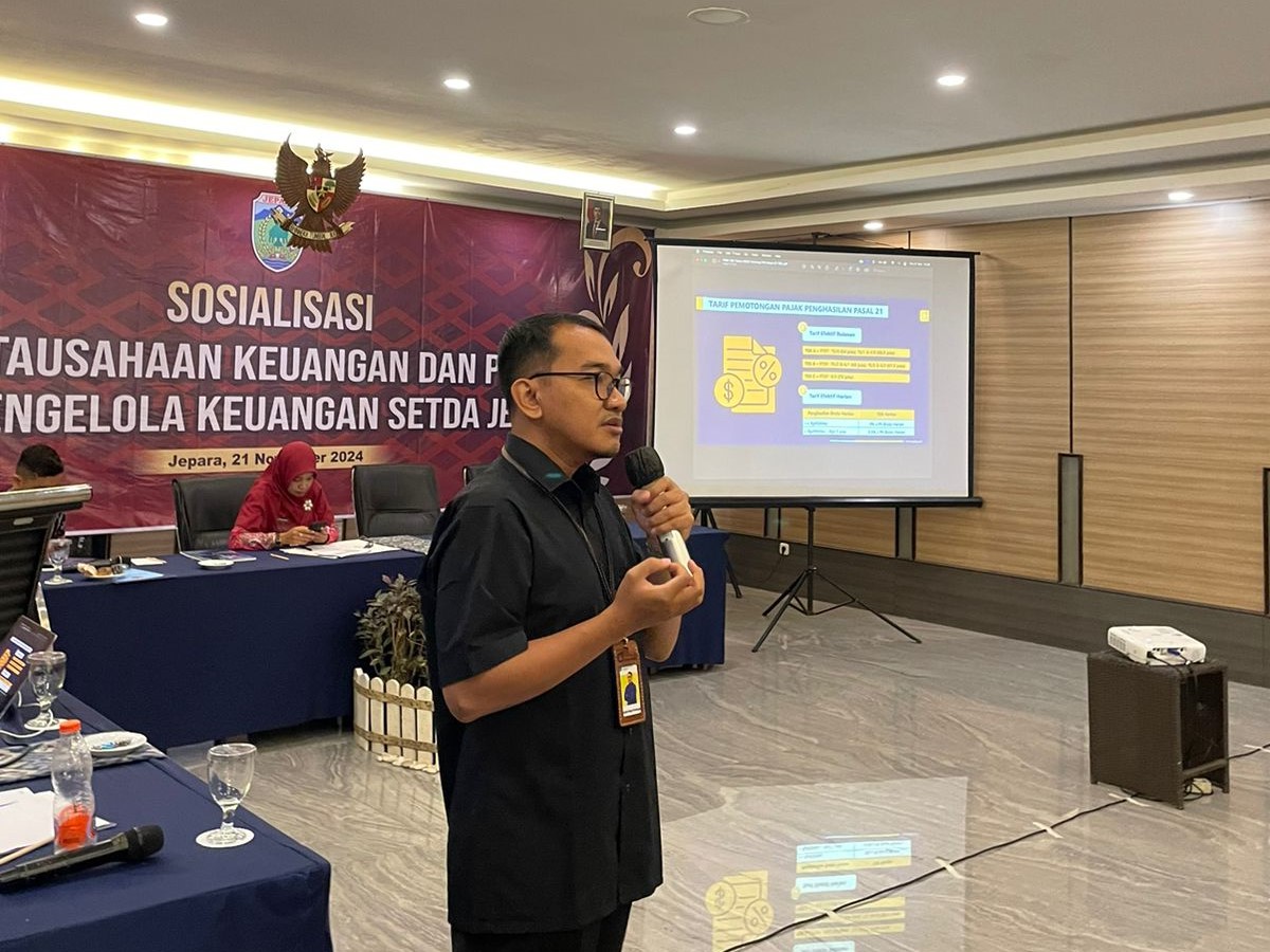 Sekretariat Daerah (Setda) Kabupaten Jepara mengadakan kegiatan Sosialisasi Penatausahaan Keuangan dan Pajak Bagi Pengelola Keuangan Setda Jepara yang diselenggarakan di Hotel D’Season Premiere Jepara, Kab. Jepara (Kamis, 21/11). Dalam kegiatan ini, dua Asisten Penyuluh Pajak Kantor Pelayanan Pajak (KPP) Pratama Jepara diminta untuk menjadi narasumber tamu. Kegiatan ini diikuti oleh sedikitnya 30 peserta yang merupakan Bendahara Pengeluaran Pembantu dan Staf Administrasi Kegiatan Setda Jepara.