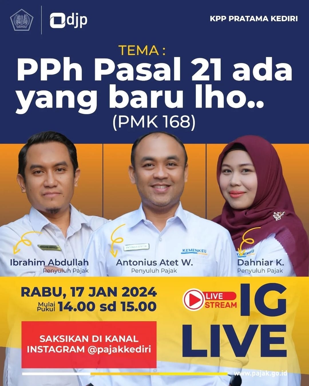 Awali tahun baru, Kantor Pelayanan Pajak (KPP) Pratama Kediri membahas materi Pajak Penghasilan (PPh) Pasal 21 bersama wajib pajak melalui siaran langsung yang dilakukan dari akun Instagram @pajakkediri (Rabu, 17/1). Siaran langsung Instagram dilakukan oleh penyuluh pajak dari studio KPP Pratama Kediri, Jalan Brawijaya Kediri, Jawa Timur. Tim Penyuluh Pajak KPP Pratama Kediri membahas tentang Peraturan Menteri Keuangan (PMK) nomor 168 tentang Petunjuk Pelaksanaan Pemotongan Pajak atas Penghasilan sehubungan dengan Pekerjaan, Jasa, atau Kegiatan Pribadi.