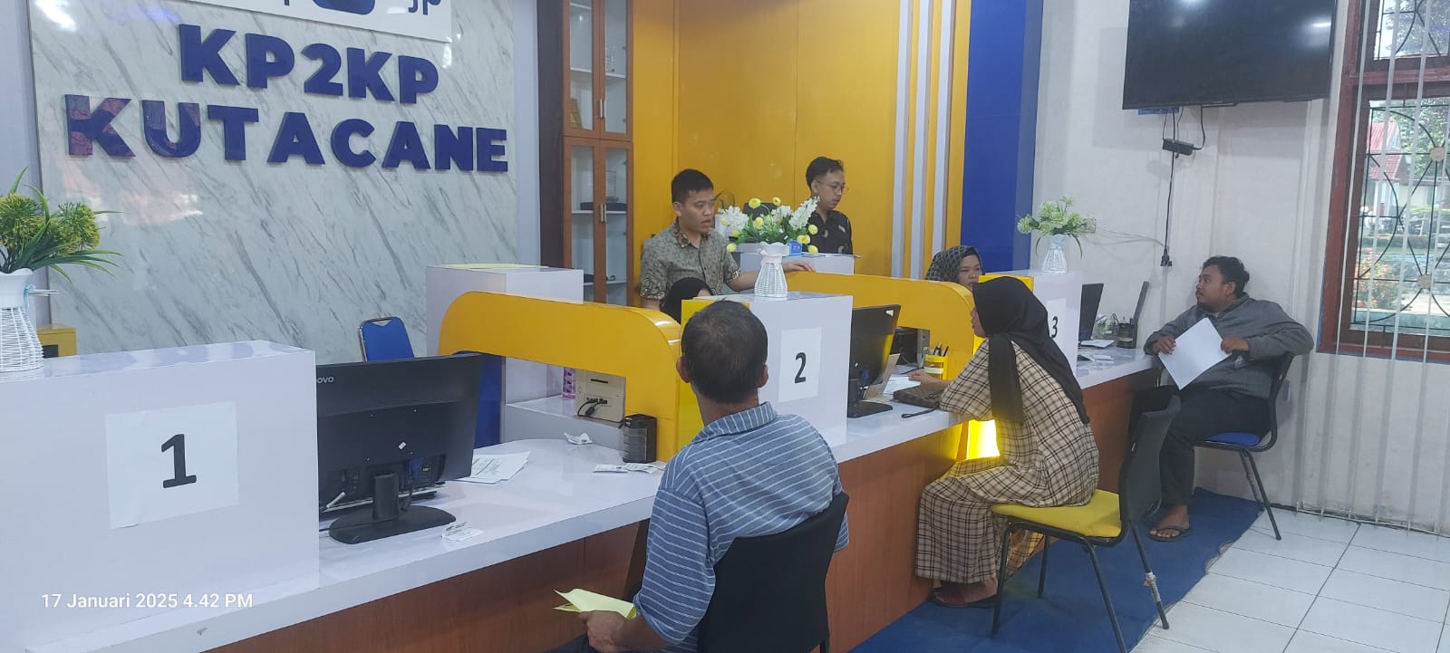 Puluhan wajib pajak mendatangi Kantor Pelayanan, Penyuluhan dan Konsultasi Perpajakan (KP2KP) Kutacane dalam rangka pendaftaran NPWP baru di Jl. Iskandar Muda No 10, Kabupaten Aceh Tenggara (Jumat, 17/1). Pendaftaran NPWP tersebut diperlukan dalam rangka administrasi kelengkapan berkas penerimaan Pegawai Pemerintah dengan Perjanjian Kerja (PPPK) maupun Wajib Pajak Orang Pribadi dalam rangka pemberian bantuan pemerintah di wilayah Kabupaten Aceh Tenggara.