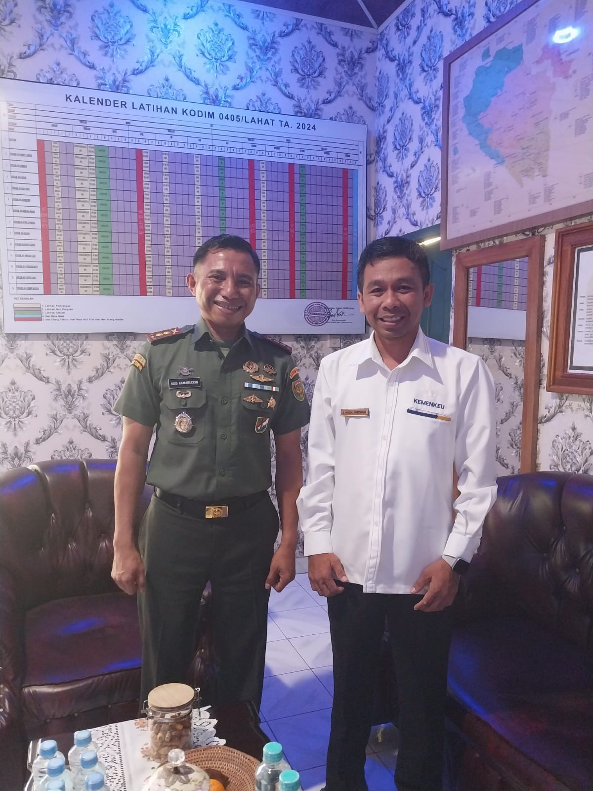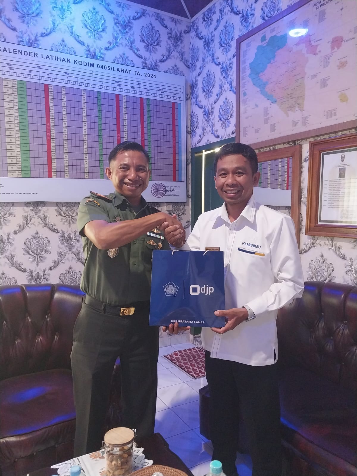 Kepala Kantor Pelayanan Pajak (KPP) Pratama Lahat Andy Whisnu Wardhana, S.E., M.B.A., Ph.D., bersama jajaran mengadakan pertemuan dengan Komandan Komando Distrik Militer (Dandim) 0405/Lahat, Letkol Inf Asis Kamaruddin (Senin, 3/6). Pertemuan ini bertujuan untuk meningkatkan kerja sama antara kedua instansi dalam rangka meningkatkan kepatuhan pajak di kalangan anggota TNI.