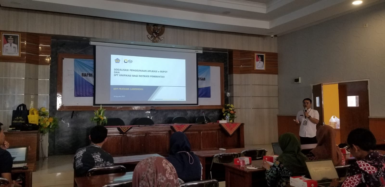 Kantor Pelayanan Pajak (KPP) Pratama Lamongan melakukan sosialisasi penggunaan aplikasi e-Bupot dan SPT Unifikasi bagi Instansi Pemerintah di Aula Widyaloka Dinas Pendidikan Kabupaten Lamongan, Lamongan (Kamis, 27/8).