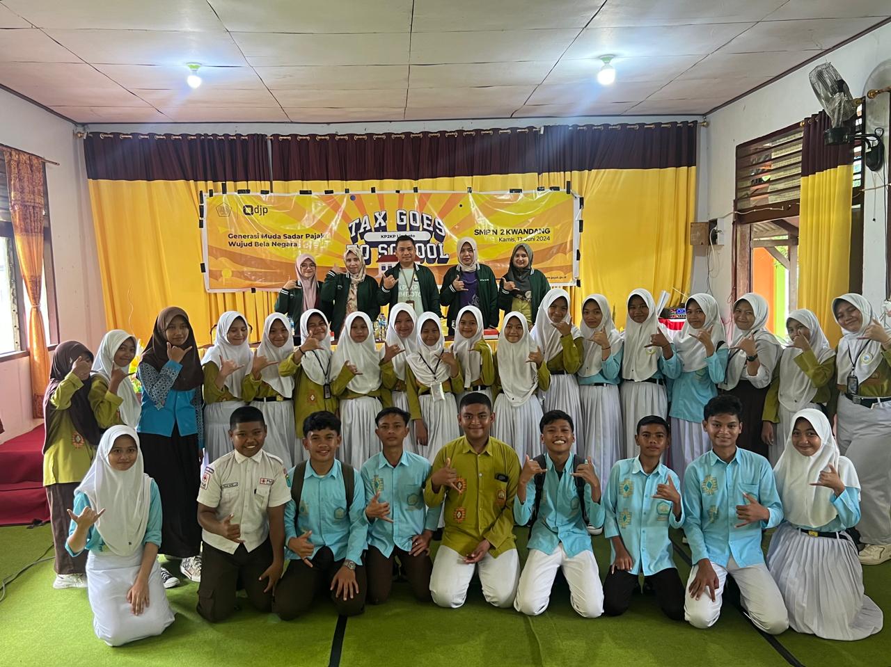 Kantor Pelayanan, Penyuluhan, dan Konsultasi Perpajakan (KP2KP) Limboto melaksanakan kegiatan Tax Goes to School (TGTS) di SMP Negeri 2 Kwandang, Gorontalo Utara, Gorontalo (Kamis, 13/6). TGTS kali ini KP2KP Limboto berkolaborasi dengan relawan pajak dari Tax Center Universitas Negeri Gorontalo dalam penyelenggaraannya.