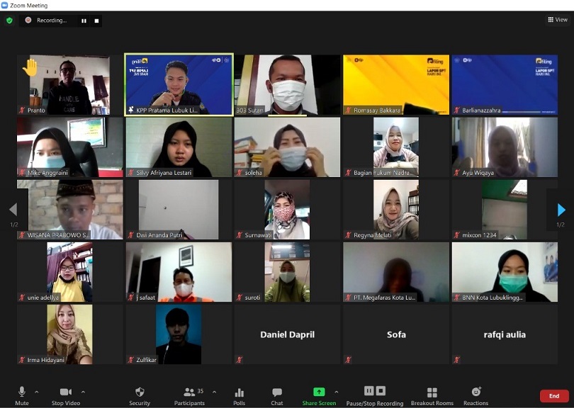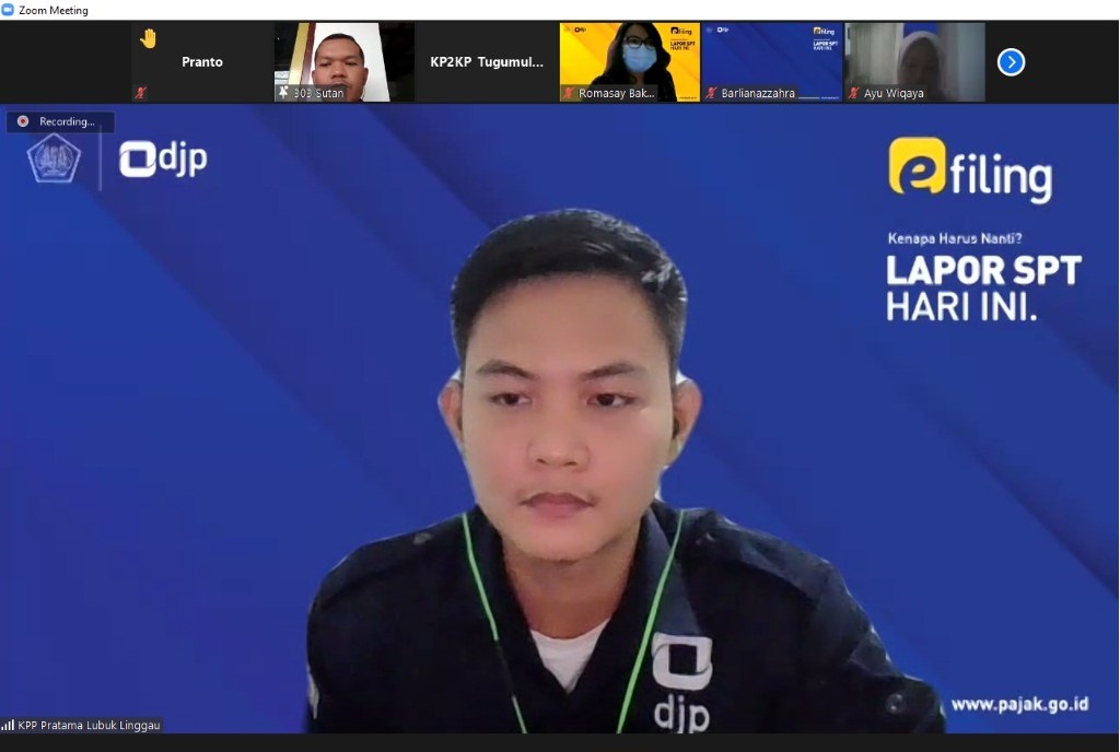 Kantor Pelayanan Pajak (KPP) Pratama Lubuklinggau dan Kantor Pelayanan, Penyuluhan, dan Konsultasi Perpajakan (KP2KP) Tugumulyo mengadakan kegiatan kelas pajak daring melalui Zoom Meeting di Lubuklinggau (Kamis, 18/2).