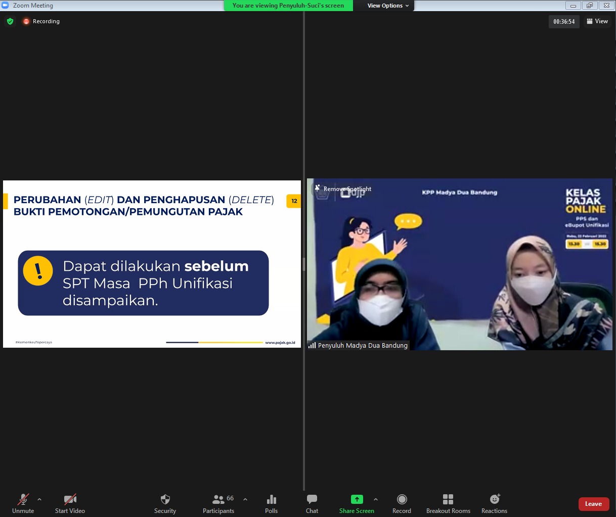 Pada sesi pemaparan materi terkait e-Bupot Unifikasi sebagaimana diatur dalam Peraturan Direktur Jenderal Pajak Nomor PER-24/PJ/2021, peserta juga diberikan contoh secara langsung cara penggunaan e-Bupot Unifikasi pada laman pajak.go.id. Kemudian, acara dilanjutkan dengan penyampaian materi tentang Program Pengungkapan Sukarela (PPS) oleh Siti dan Suci.