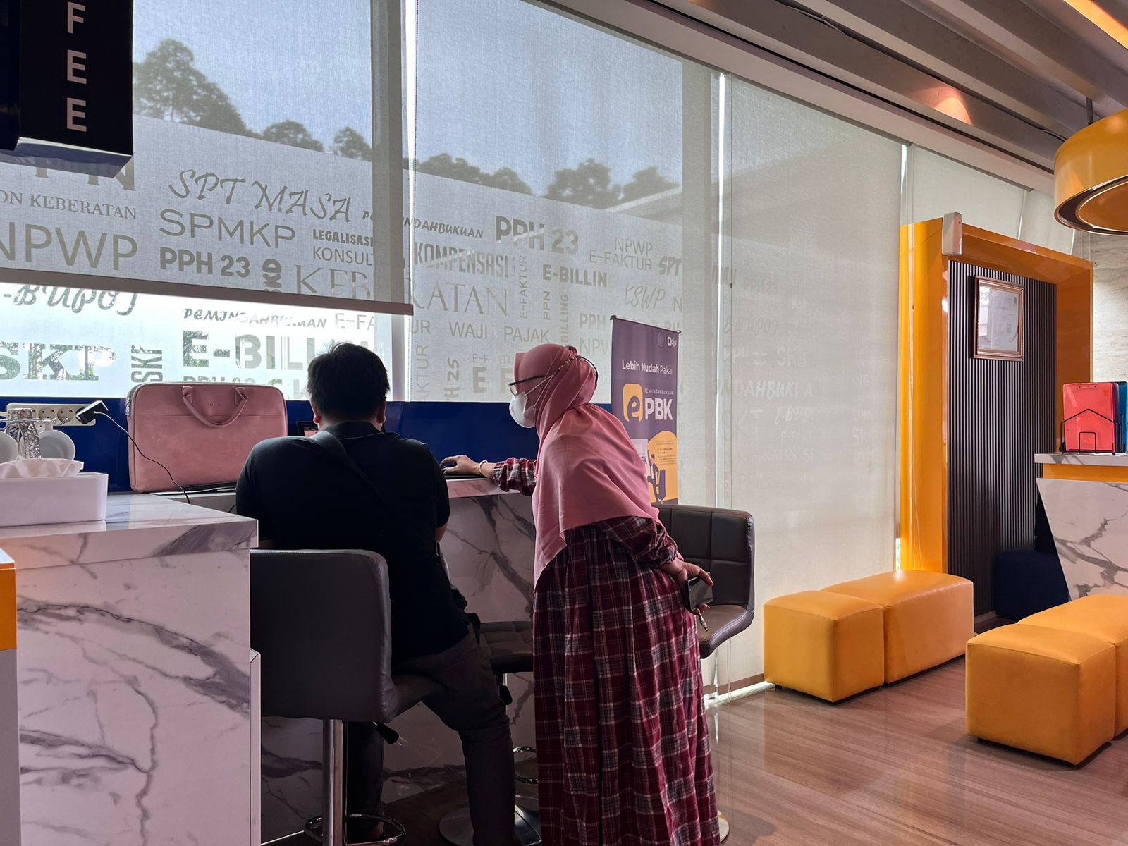 Penyuluh Pajak Kantor Pelayanan Pajak (KPP) Madya Tangerang memberikan asistensi kepada wajib pajak yang datang dan memerlukan asistensi dalam pemenuhan kewajiban perpajakannya secara langsung di KPP Madya Tangerang, Jalan Jalur Sutera Barat No.3, RT.003/RW.006, Panunggangan Timur, Pinang, Kota Tangerang, Banten (Selasa, 23/1).
