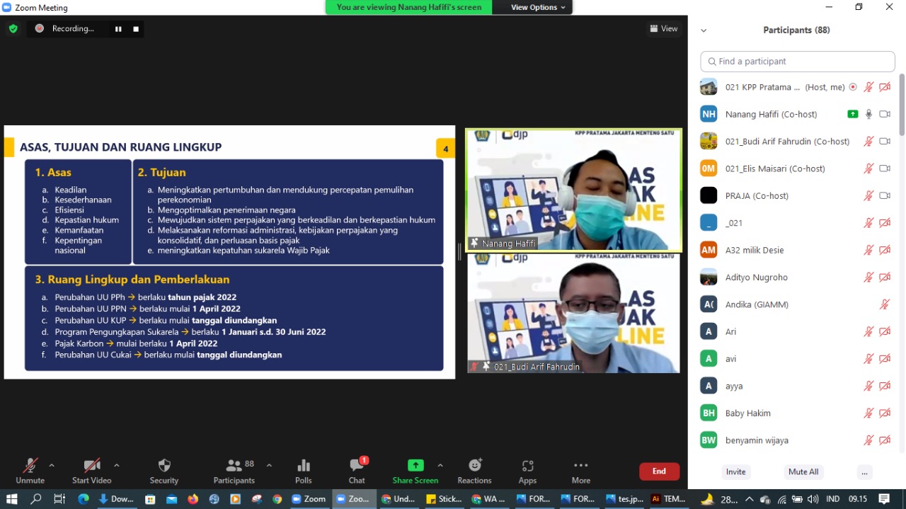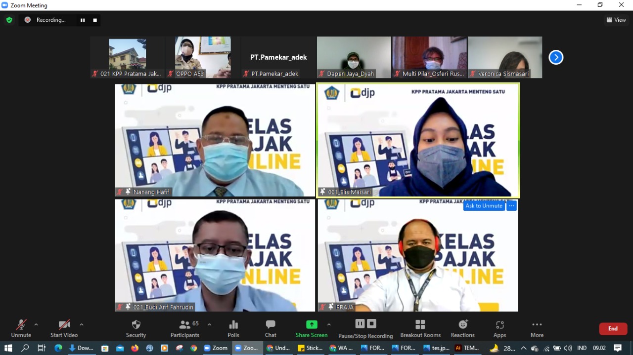 Kantor Pelayanan Pajak (KPP) Pratama Jakarta Menteng Satu mengadakan kelas pajak dengan tema 'Mengenal UU Harmonisasi Peraturan Perpajakan (UU HPP)' secara daring melalui aplikasi Zoom Meeting kepada wajib pajak di Jakarta (Rabu, 1/12).