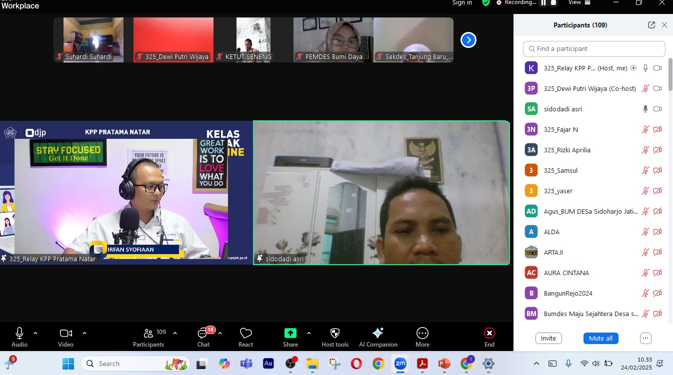 Kantor Pelayanan Pajak (KPP) Pratama Natar mengadakan Kelas Pajak Coretax DJP bagi Instansi Pemerintah Desa se-Kabupaten Lampung Selatan secara daring melalui kanal Zoom Meeting (Senin, 24/2). Kegiatan ini diikuti oleh 105 peserta dan dilaksanakan sebagai bagian dari upaya meningkatkan pemahaman dan kepatuhan perpajakan di lingkungan pemerintahan desa.