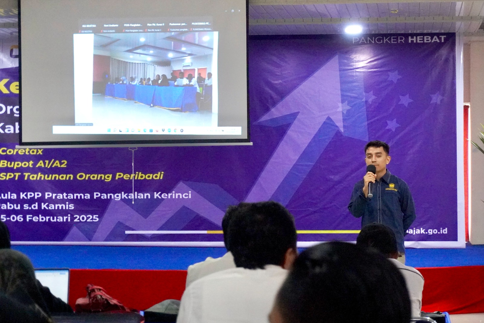 Kantor Pelayanan Pajak (KPP) Pratama Pangkalan Kerinci mengadakan kegiatan Sosialisasi dan Asistensi Perpajakan bagi Instansi Pemerintah Daerah Kabupaten Pelalawan yang berlangsung selama dua hari di Aula Lantai III KPP Pratama Pangkalan Kerinci (Rabu, 5/2). Kegiatan ini bertujuan untuk memberikan pemahaman yang lebih mendalam mengenai kewajiban perpajakan instansi pemerintah daerah khususnya terkait pembuatan Bukti Potong 1721-A1/A2 tahun 2024 serta implementasi sistem perpajakan terbaru Coretax DJP.