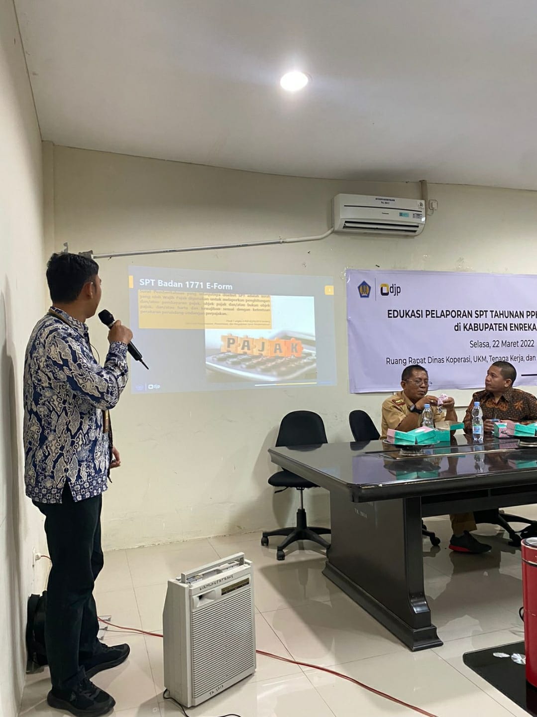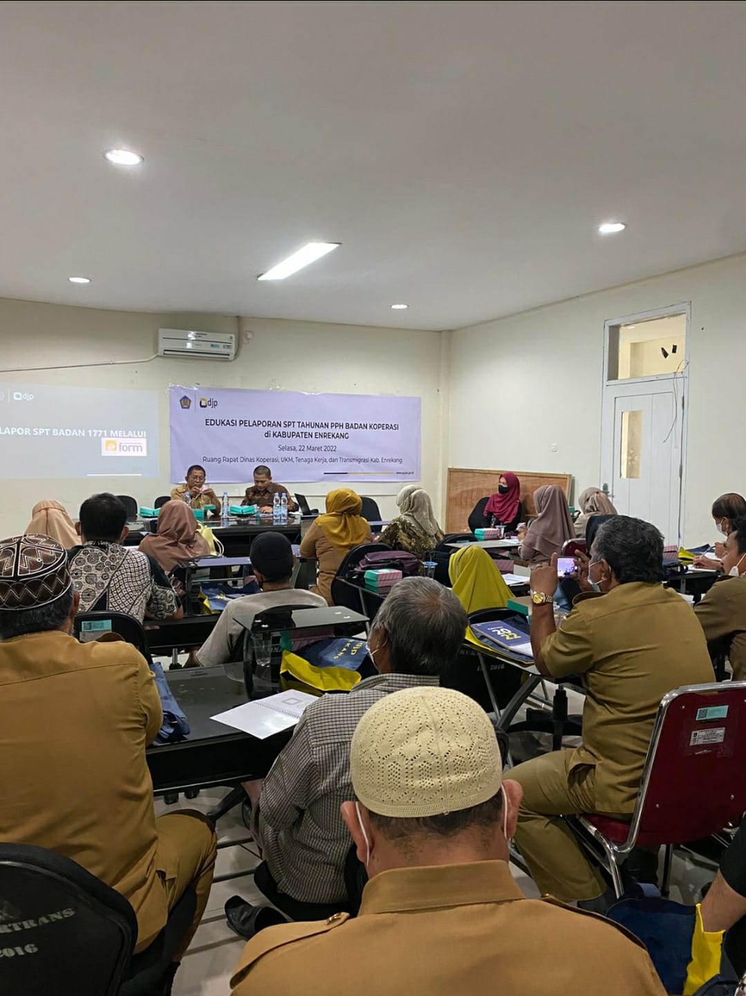 Tim Penyuluh Pajak Kantor Pelayanan Pajak (KPP) Pratama Parepare bersama Kantor Pelayanan, Penyuluhan dan Konsultasi Perpajakan (KP2KP) Enrekang menggelar edukasi pelaporan SPT Tahunan PPH Badan untuk Koperasi di Lingkungan Kabupaten Enrekang (Selasa, 22/03). Acara ini berlangsung di Ruang Rapat Dinas Koperasi, UKM, Tenaga Kerja dan Transmigrasi (Gedung GADIS Lantai 2) Kabupaten Enrekang.