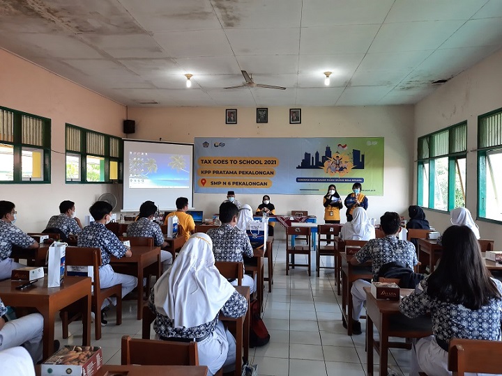 Kantor Pelayanan Pajak (KPP) Pratama Pekalongan menyelenggarakan kegiatan Tax Goes To School (TGTS) 2021 di Sekolah Menengah Pertama Negeri (SMP N) 6 Pekalongan Kota Pekalongan (Rabu, 25/11). Kegiatan ini berlangsung di ruang kelas dan diikuti oleh tiga puluh perwakilan siswa/i SMP Negeri 6 Pekalongan.TGTS yang merupakan agenda rutin tahunan ini dilaksanakan secara luring dengan tetap menerapkan protokol kesehatan.