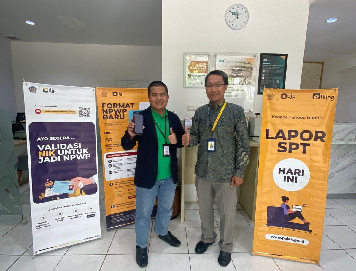 Kepala Kantor Pelayanan, Penyuluhan, dan Konsultasi Perpajakan (KP2KP) Pelabuhan Ratu Djoko Widodo memberikan asistensi pemutakhiran data mandiri Nomor Induk Kependudukan (NIK) sebagai Nomor Pokok Wajib Pajak (NPWP) langsung kepada Kepala Bank Syariah Indonesia (BSI) Pelabuhan Ratu Teguh Santoso di ruang kerja BSI Pelabuhan Ratu, Jalan A. Yani No.24, Palabuhanratu, Kabupaten Sukabumi (Selasa, 07/02).