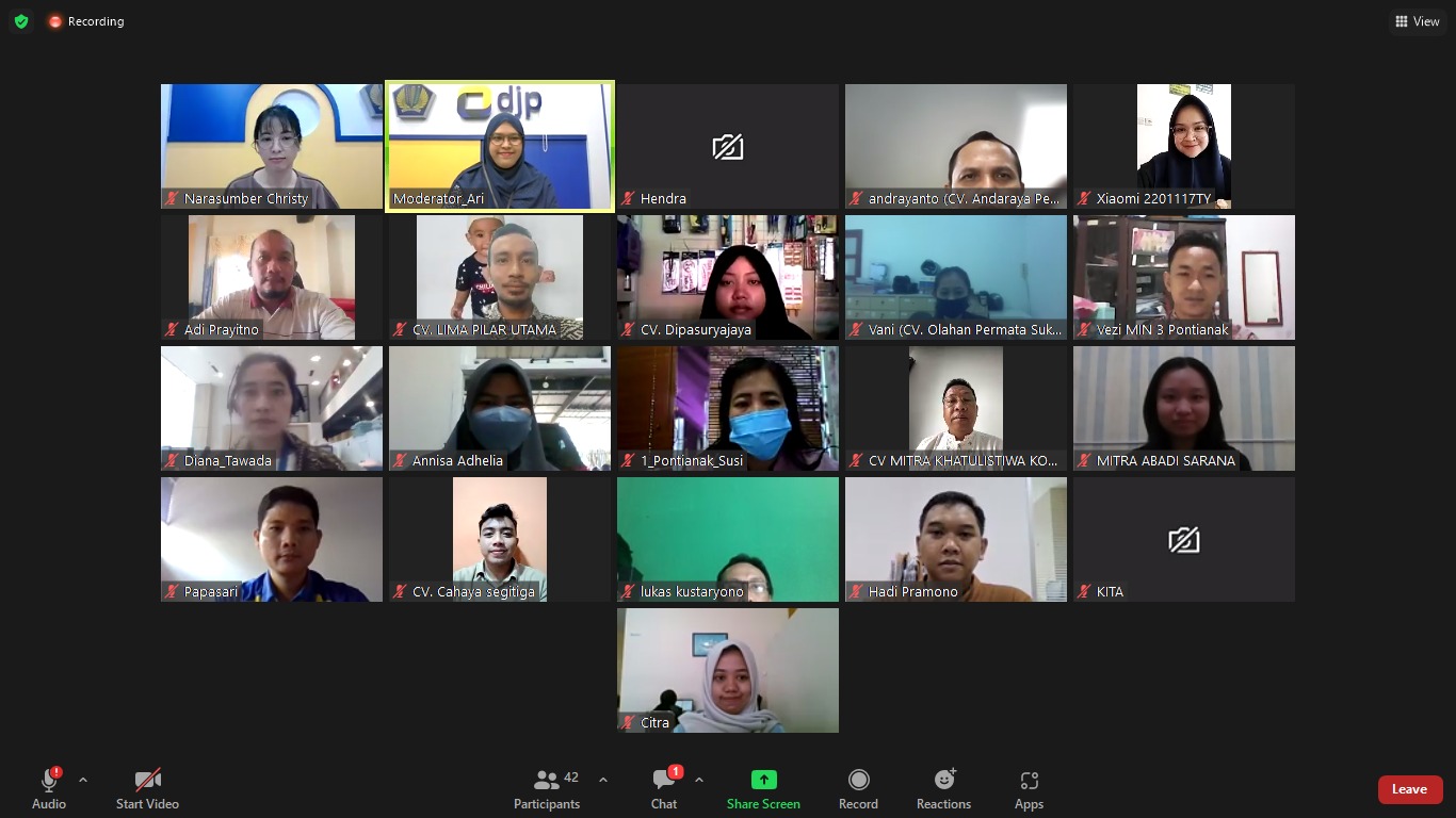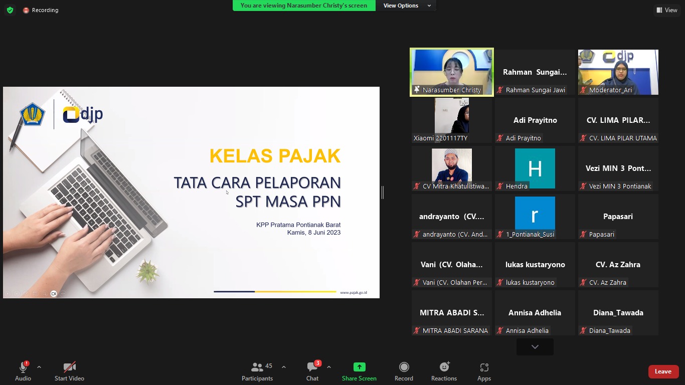 Kantor Pelayanan Pajak (KPP) Pratama Pontianak Barat menggelar kelas pajak tentang Tata Cara Pelaporan Surat Pemberitahuan (SPT) Masa Pajak Pertambahan Nilai secara daring (Kamis, 8/6). Kegiatan ini dihadiri oleh 55 wajib pajak yang terdaftar pada tahun 2022 dan telah ditetapkan sebagai Pengusaha Kena Pajak (PKP) di wilayah kerja KPP Pratama Pontianak Barat. Adapun tujuan kegiatan ini agar seluruh wajib pajak perusahaan mengerti akan kewajiban perpajakannya sehingga dapat melaporkan SPT Masa PPN dengan tepat dan benar setiap bulannya.