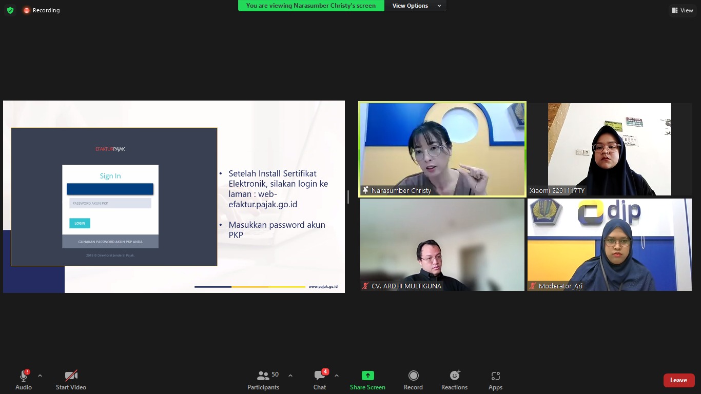 Acara pun diakhiri dengan serta sesi tanya jawab untuk para peserta. “Apabila sertifikat elektroniknya hilang atau sudah kadaluarsa, maka Bapak/Ibu bisa mengunduhnya kembali melalui website e-Nofa di pajak.go.id/,” ucap Christy.