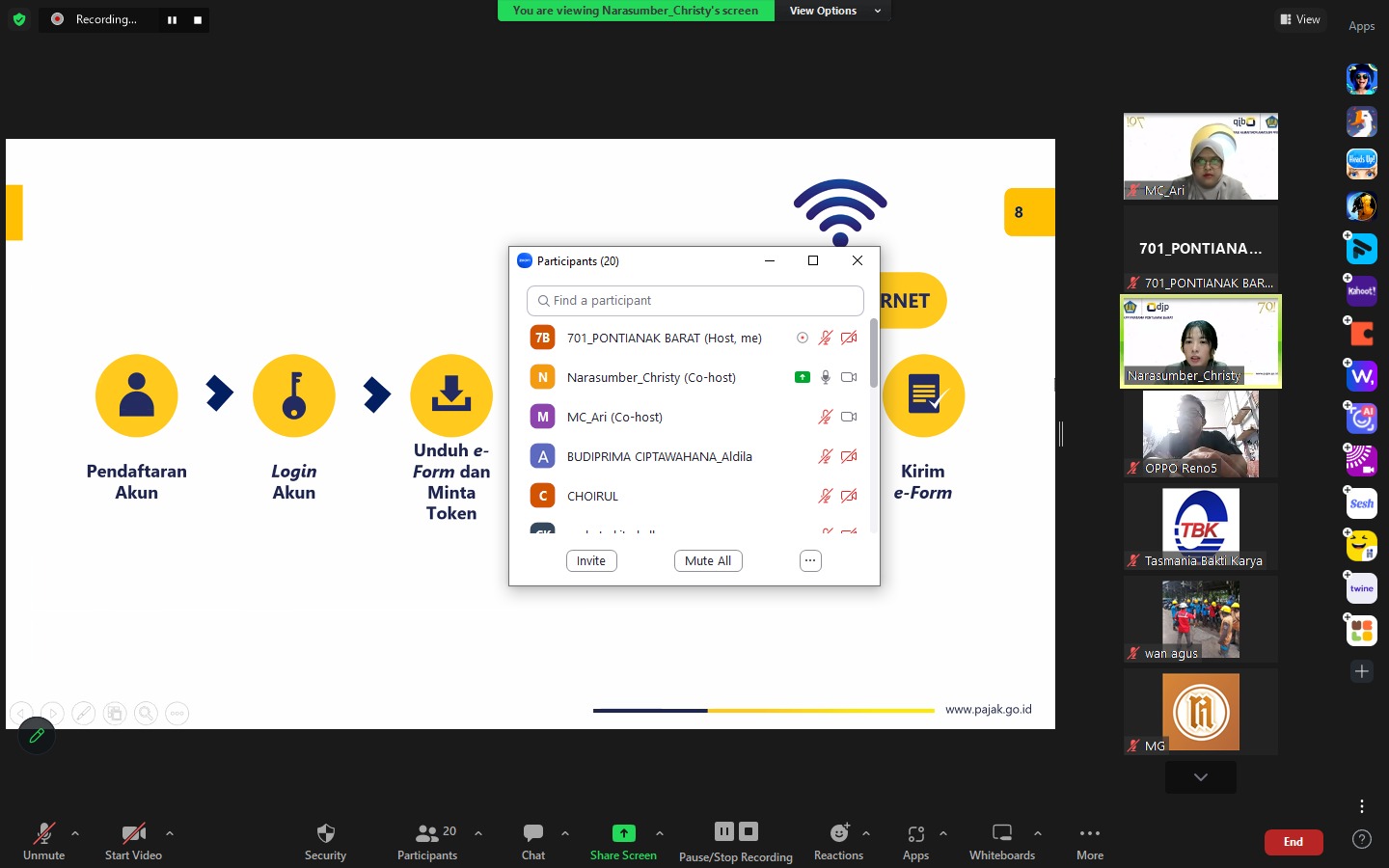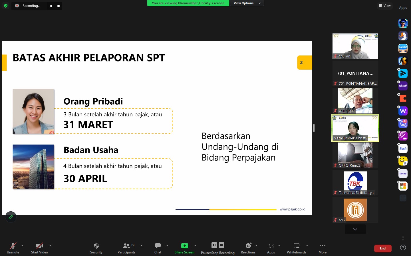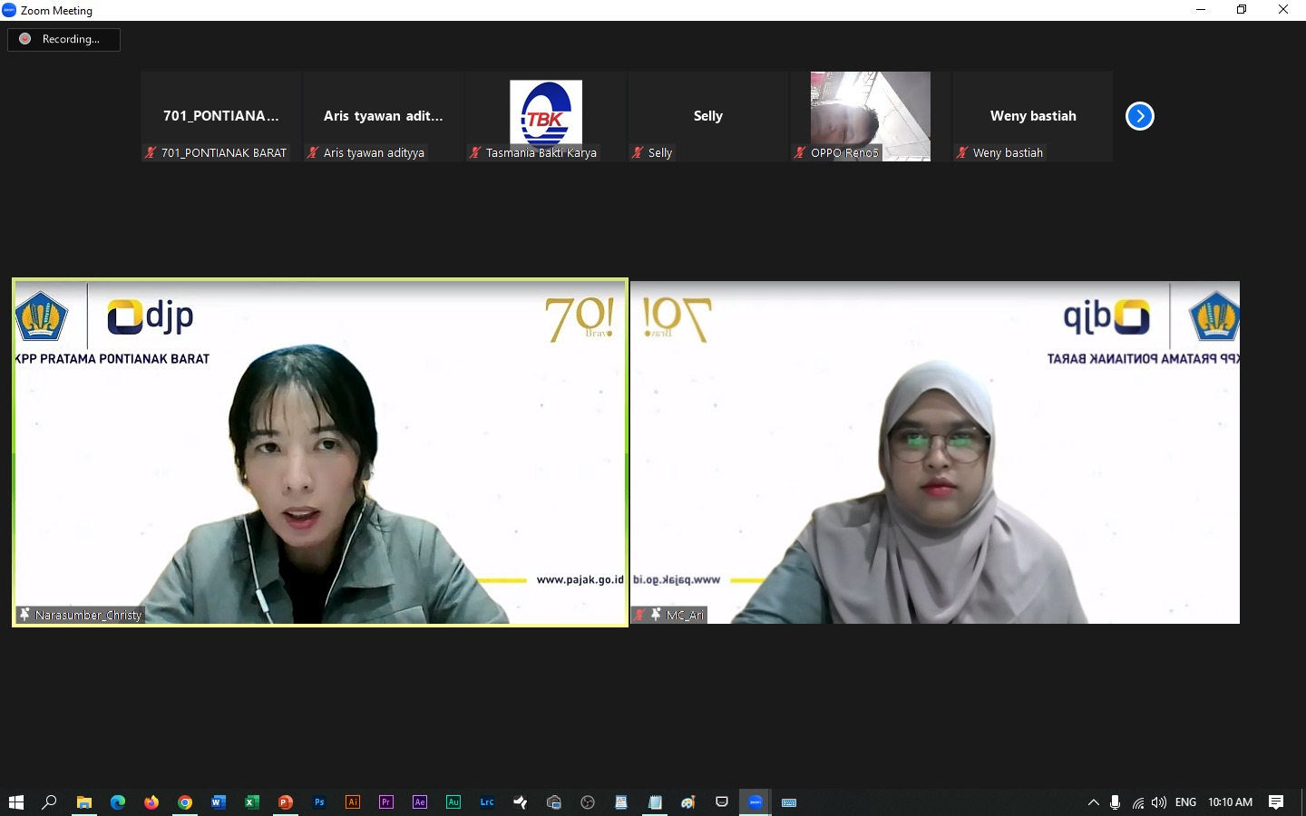 Kantor Pelayanan Pajak (KPP) Pratama Pontianak Barat mengadakan Kelas Pajak Pelaporan SPT Tahunan Pajak Penghasilan Badan dan Pemutakhiran Nomor Induk Kependudukan (NIK) sebagai Nomor Pokok Wajib Pajak (NPWP) secara daring di KPP Pratama Pontianak Barat (Senin, 8/5).