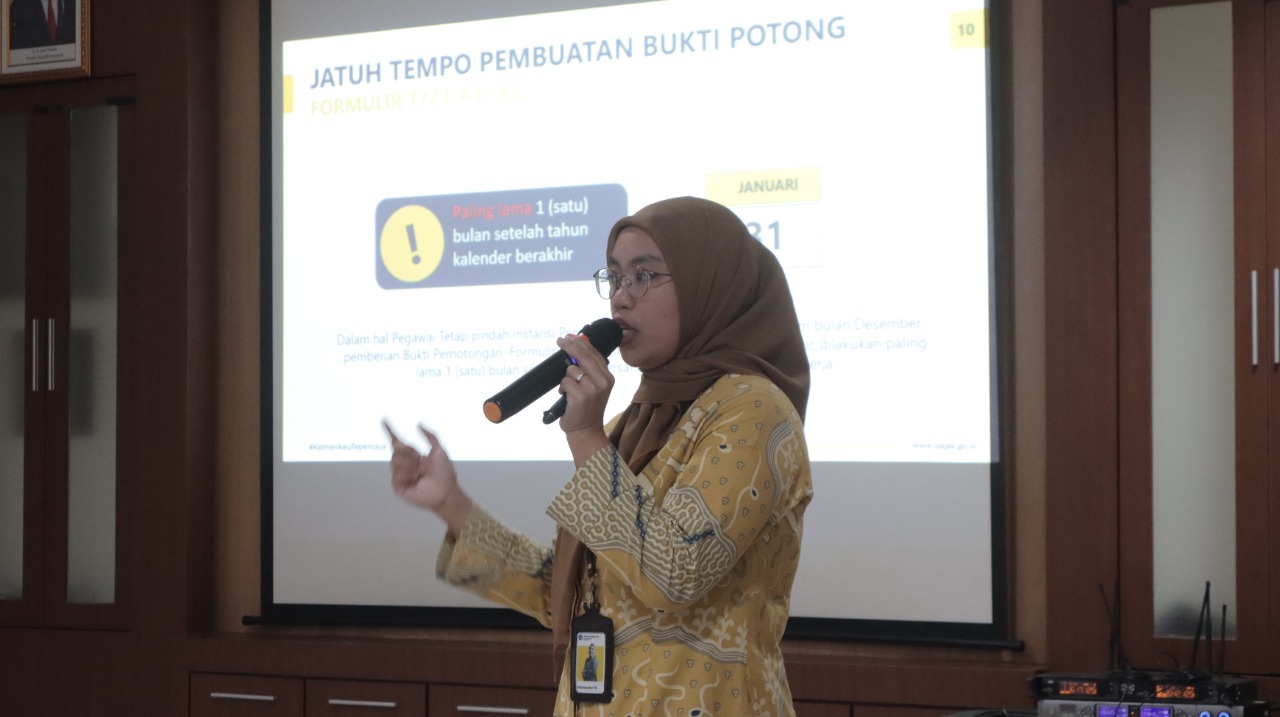 Acara dilanjutkan dengan penyampaian materi Pembuatan Bukti Potong 1721-A2 oleh Tim Penyuluh KPP Pratama Pontianak Barat Indaraputuri Nurmasruri. Indara menyampaikan tahap demi tahap pembuatan bukti potong 1721-A2 serta membuka sesi tanya jawab untuk para peserta. Para peserta mulai melontarkan berbagai macam pertanyaan, baik dalam pembuatan bukti potong pajak maupun kewajiban perpajakan bendahara.