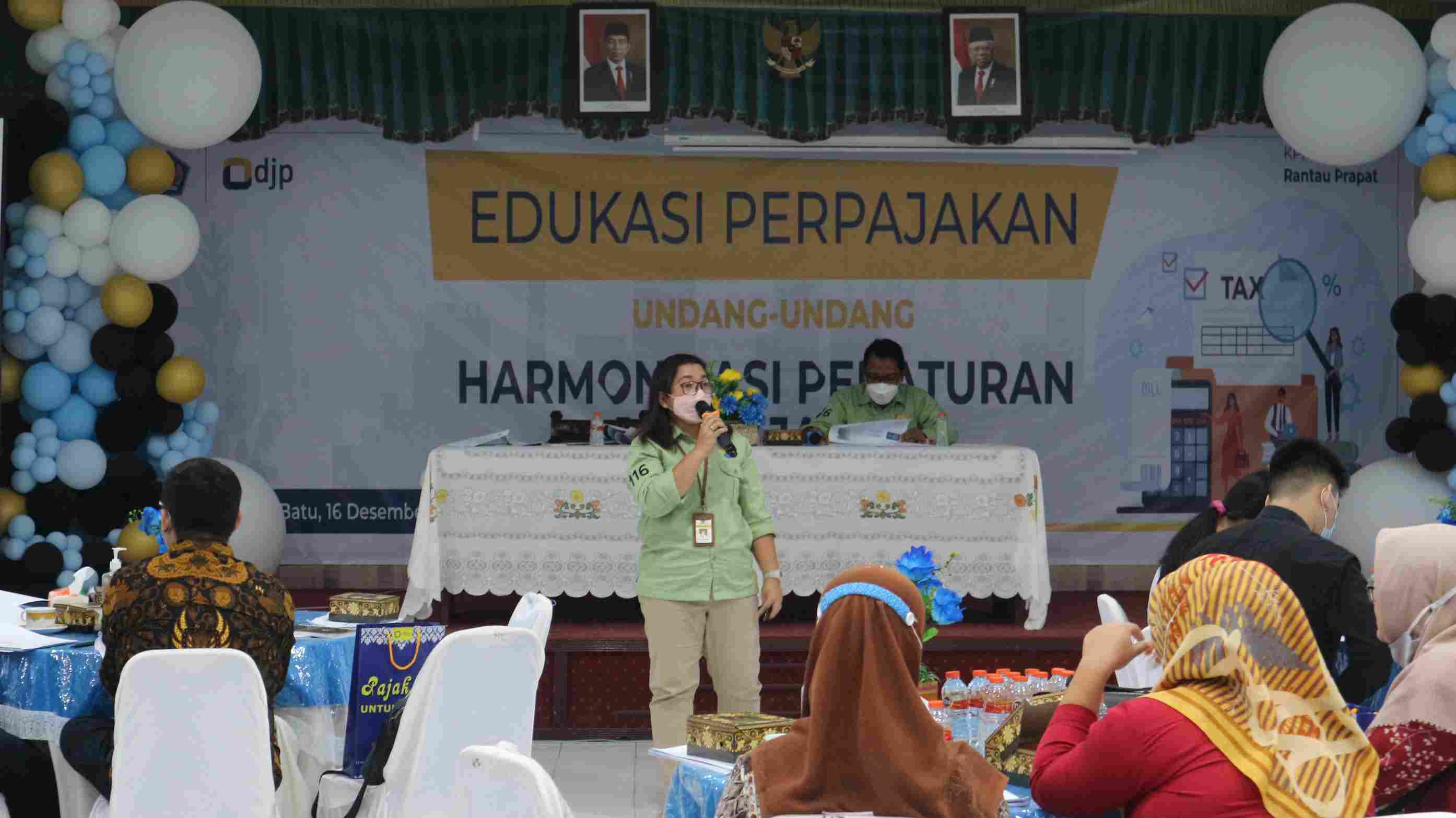 Kantor Pelayanan Pajak (KPP) Pratama Rantau Prapat mengadakan edukasi perpajakan di Aula KPP Pratama Rantau Prapat di Kabupaten Labuhan Batu, Sumatera Utara (Rabu, 16/12). Dalam kesempatan kali ini, penyuluh memberikan edukasi perpajakan tentang undang-Undang (UU) Harmonisasi Peraturan Perpajakan (HPP) kepada wajib pajak prominen. Acara dikemas dengan sistem pemberian materi edukasi kemudian dilanjutkan dengan sesi tanya jawab.