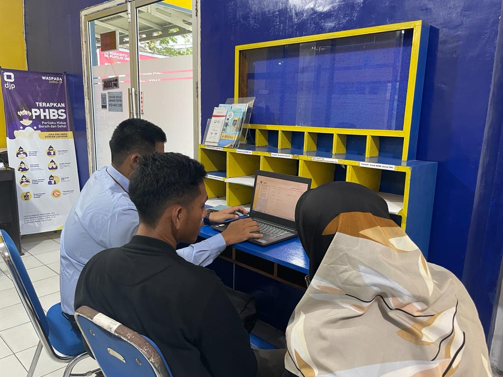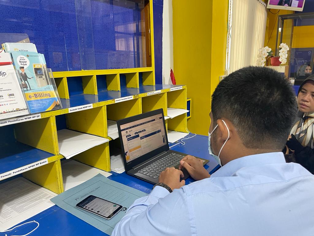 Petugas helpdesk Kantor Pelayanan, Penyuluhan, dan Konsultasi Perpajakan (KP2KP) Sanana Hanif Maulana Iqbal memberikan bantuan pembuatan kode billing kepada Pengusaha Kena Pajak (PKP) yang baru dikukuhkan (Rabu, 19/10).