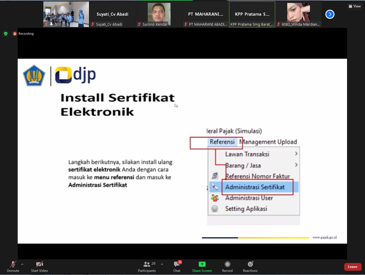 Kantor Pelayanan Pajak (KPP) Pratama Semarang Barat mengadakan kelas pajak terkait update aplikasi e-Faktur 3.2  dengan mengundang 25 Pengusaha Kena Pajak yang terdaftar di wilayah kerja Semarang Barat. Acara kelas pajak diadakan secara tatap muka dan bagi yang berhalangan hadir dapat mengikuti  secara daring melalui zoom di Semarang (Rabu, 6/4).