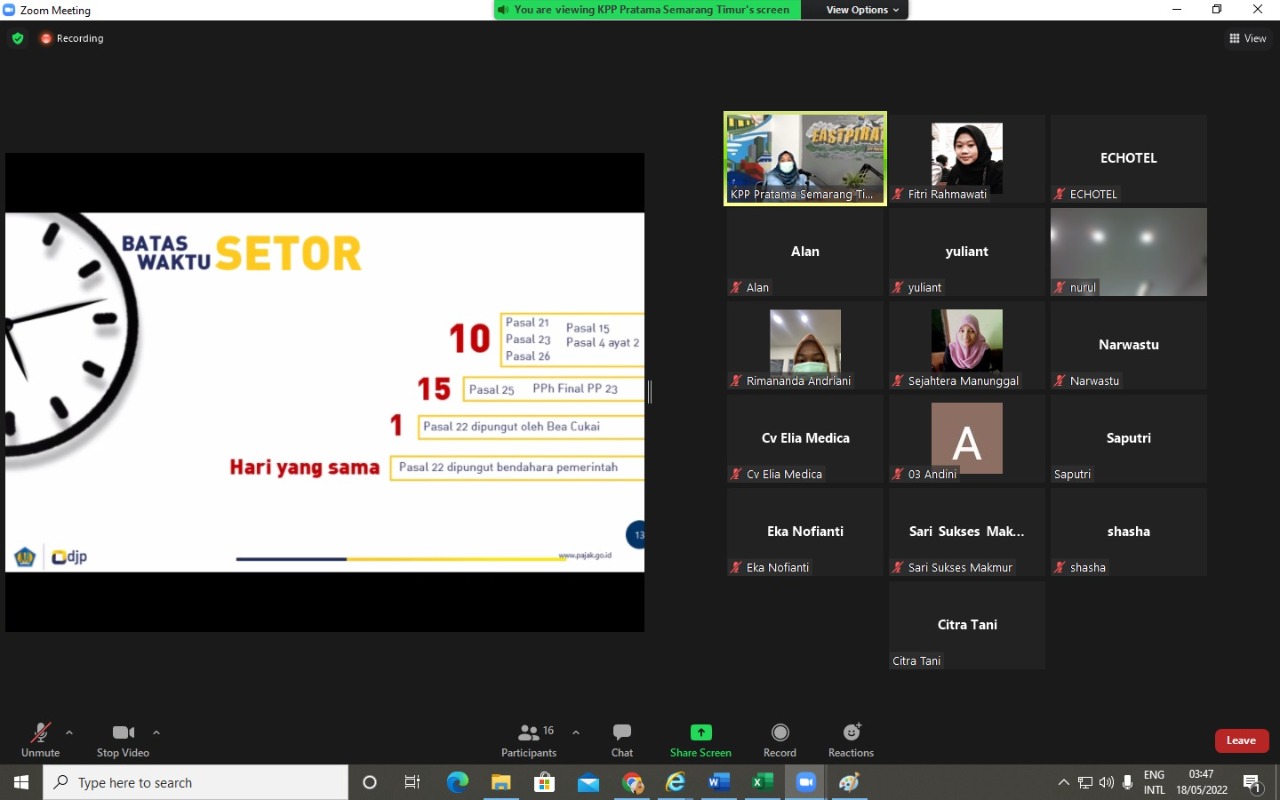 Kantor Pelayanan Pajak (KPP) Semarang Timur menyelenggarakan kegiatan edukasi Hak dan Kewajiban Wajib Pajak Badan yang terdaftar di tahun 2022 secara daring melalui Aplikasi Zoom Meeting di Semarang (Rabu, 18/5).