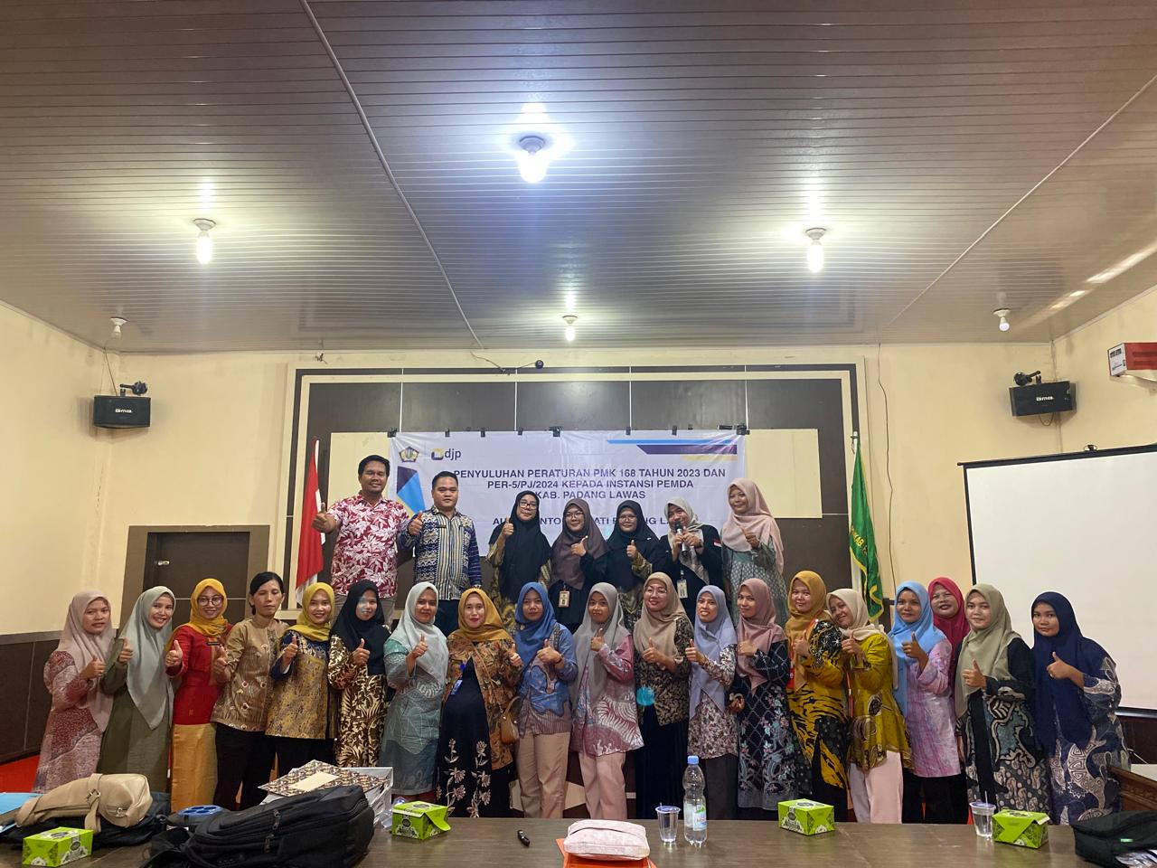 Kantor Pelayanan Pajak (KPP) Pratama Padang Sidempuan (Pajak Sidempuan) melakukan penyuluhan peraturan perpajakan Peraturan Menteri Keuangan Nomor 168 Tahun 2023 dan Peraturan Direktur Jenderal Pajak nomor PER-5/PJ/2024 kepada Instansi Pemerintah Daerah Kabupaten Padang Lawas bertempat di Aula Kantor Bupati Kabupaten Padang Lawas (Kamis, 28/6). Hadir dari Pajak Sidempuan Penyuluh Pajak Herfina Dewi Siregar dan Indah Lestari Simanungkalit.