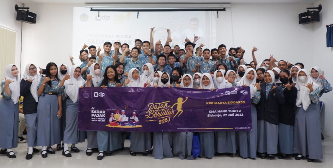 Kantor Pelayanan Pajak (KPP) Madya Sidoarjo bersama Sekolah Menengah Atas (SMA) Hang Tuah 2 Sidoarjo turut meramaikan kegiatan Pajak Bertutur 2023. Berbekal gawai sebagai media absensi dan pembelajaran, sebanyak 100 Siswa Kelas XII SMA Hang Tuah 2 Sidoarjo mengikuti Kegiatan Pajak Bertutur yang bertempat di Aula SMA Hang Tuah 2 Sidoarjo, Kab. Sidoarjo (Kamis, 27/7).