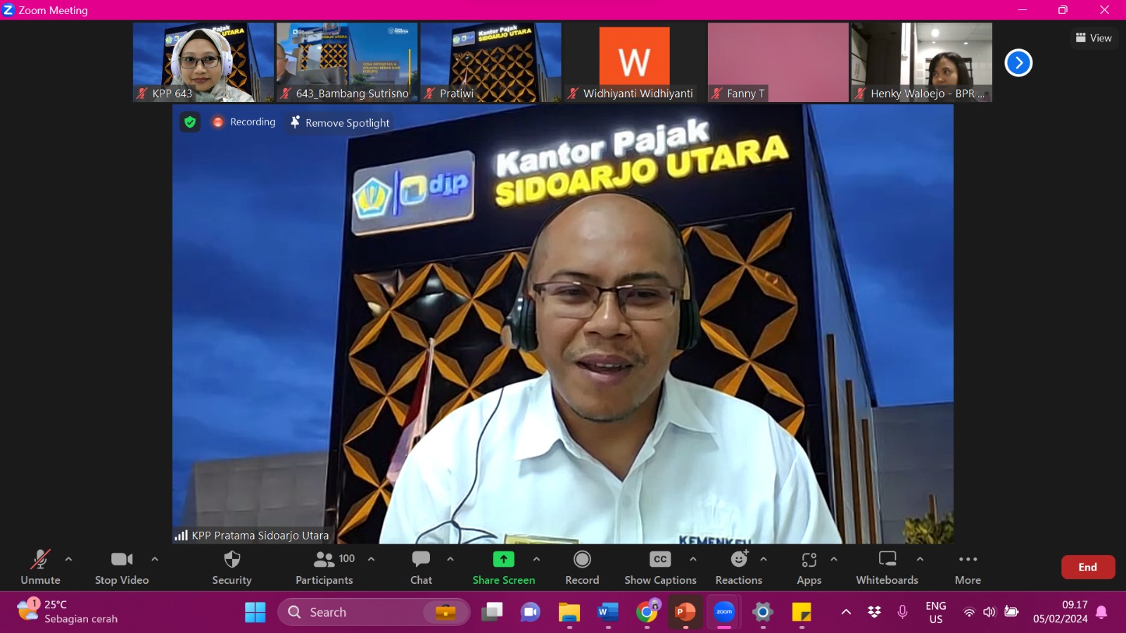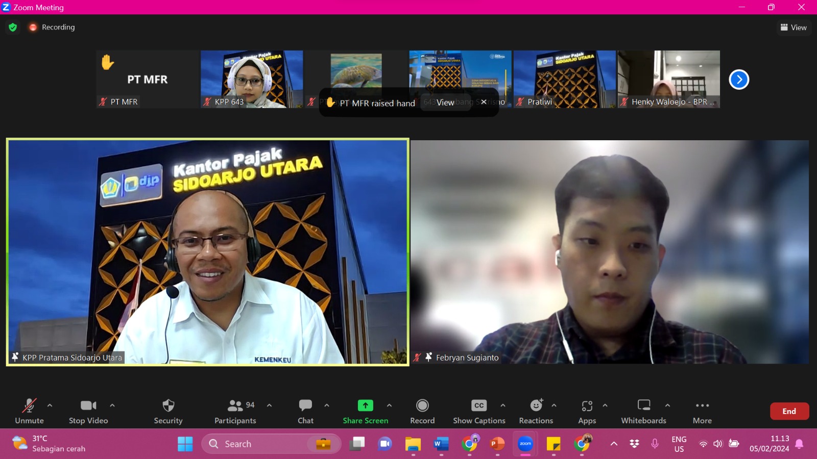 Kantor Pelayanan Pajak (KPP) Pratama Sidoarjo Utara mengadakan sosialisasi Peraturan Menteri Keuangan Nomor 168 Tahun 2023 (PMK 168/2023) terkait E-Bupot PPh Pasal 21/26 bagi wajib pajak badan secara daring melalui media aplikasi Zoom Meeting di Sidoarjo, Jawa Timur (Senin, 5/2). Sosialisasi aturan perpajakan baru ini dimulai pukul 09.00 WIB hingga pukul 11.00 WIB. Kegiatan ini diikuti oleh sekitar 100 wajib pajak di wilayah Kecamatan Buduran, Gedangan, Sedati, dan Waru .