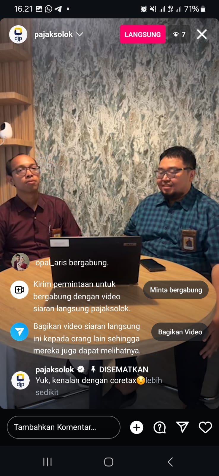 Kantor Pelayanan Pajak (KPP) Pratama Solok mengadakan kegiatan yang inovatif dengan tujuan untuk mengedukasi dan mendekatkan diri dengan para wajib pajak (Kamis, 27/6). Kegiatan tersebut berupa sesi Live Instagram dengan narasumber Teguh Alam Putra, Asisten Penyuluh Pajak Mahir KPP Pratama Solok.