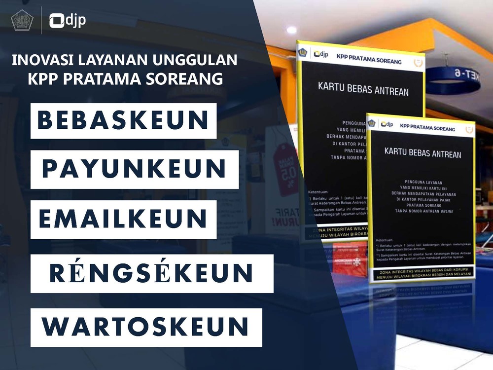 "Bebaskeun, Payunkeun, Emailkeun, Réngsékeun, jeung Wartoskeun adalah layanan baru di KPP Soreang yang diperuntukan bagi internal maupun eksternal (wajib pajak) sebagai bentuk nyata komitmen kami untuk terus berinovasi guna menciptakan layanan yang responsif, efektif, mudah diakses, dan memberikan kepuasan bagi seluruh wajib pajak," demikian disampaikan Kepala Kantor KPP Soreang Gunung Herminto Siswantoro saat ditemui di ruang kerjanya, Jalan Raya Cimareme nomor 205, Kabupaten Bandung Barat (Kamis, 13/4).