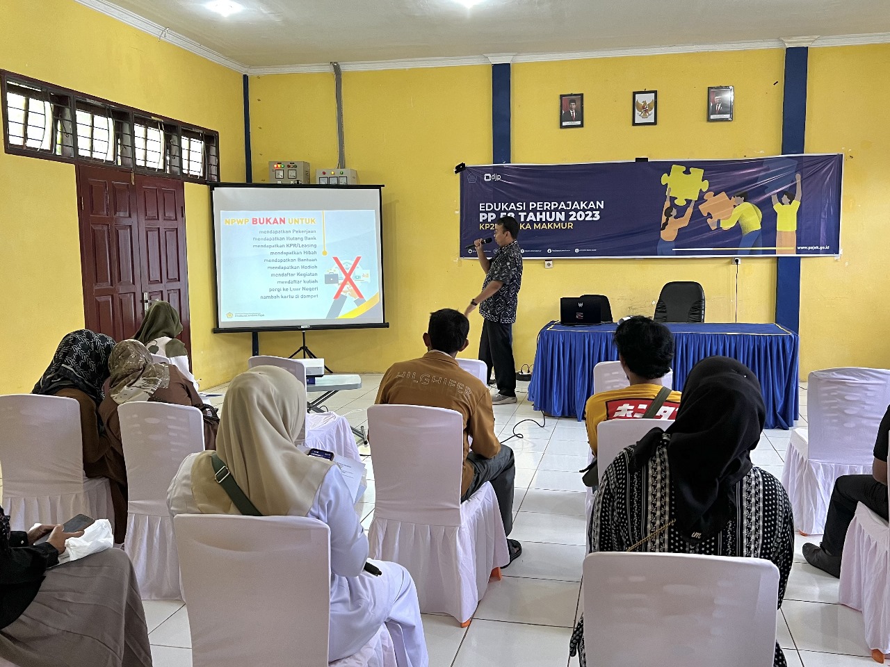 Kantor Pelayanan, Penyuluhan, dan Konsultasi Perpajakan (KP2KP) Suka Makmur adakan sosialisasi hak dan kewajiban perpajakan wajib pajak orang pribadi di Aula KP2KP Suka Makmur (Selasa, 7/5). Kegiatan ini dilaksanakan dengan tujuan untuk memberikan pengetahuan kepada wajib pajak atas hak dan kewajiban perpajakan sehingga mereka dapat melakukan kewajiban perpajakan dengan baik dan benar.