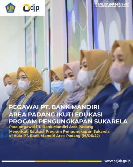 Kantor Wilayah Direktorat Jenderal Pajak Sumatera Barat dan Jambi (Kanwil DJP Sumbar dan Jambi) bekerja sama dengan PT. Bank Mandiri Area Padang melaksanakan kegiatan dengan tajuk Edukasi Program Pengungkapan Sukarela (PPS) bagi pegawai PT. Bank Mandiri Area Padang di Aula PT. Bank Mandiri Area Padang (Kamis, 16/6). Dengan diadakannya kegiatan edukasi PPS ini, Kanwil DJP Sumbar dan Jambi berharap jajaran pegawai PT. Bank Mandiri Area Padang dapat mengikuti dan memanfaatkan PPS sekaligus menjadi pusat informasi bagi para nasabah Bank Mandiri yang membutuhkan informasi mengenai PPS.