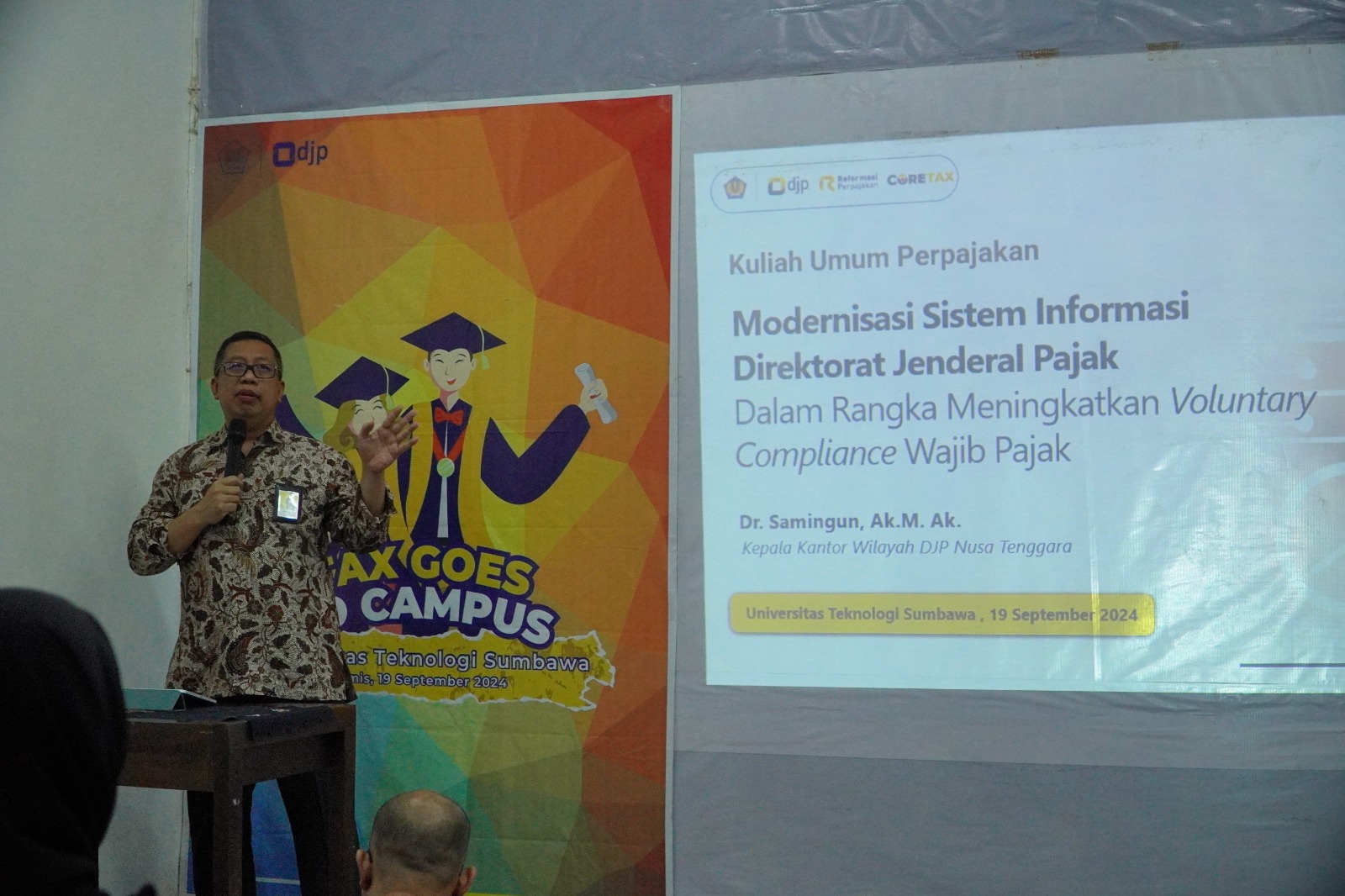 Tak hanya fokus pada Wajib Pajak saat ini, KPP Pratama juga menggandeng generasi muda melalui kegiatan Tax Goes to School (TGTS) dan Tax Goes to Campus (TGTC). Pada kuliah umum bertema Modernisasi Sistem Informasi DJP yang digelar September lalu, mahasiswa menunjukkan antusiasme yang luar biasa. Pada kuliah umum tersebut dijelaskan peran-peran penting generasi muda dalam transformasi perpajakan di Indonesia. Benny Santosa selaku kepala Kantor Pelayanan Pajak Pratama Sumbawa Besar juga turut andil dalam kegiatan ini. Beliau menyampaikan bahwa TGTC ini bertujuan untuk mengenalkan kesadaran pajak bagi mahasiswa. “Kesadaran pajak ini adalah tanggung jawab kita bersama, termasuk civitas akademika. Oleh karenanya kegiatan ini sangat penting untuk menumbuhkan kesadaran pajak di kalangan mahasiswa yang nantinya ke depan mereka akan menjadi Wajib Pajak,” lanjut Benny.