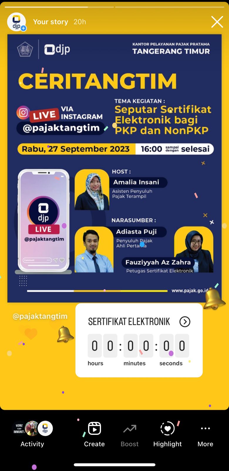 Melalui akun Instagram resmi @pajaktangtim, Asisten Penyuluh Pajak Terampil KPP Pratama Tangerang Timur Amalia Insani selaku host memandu live instagram untuk membahas serba-serbi Sertifikat Elektronik.