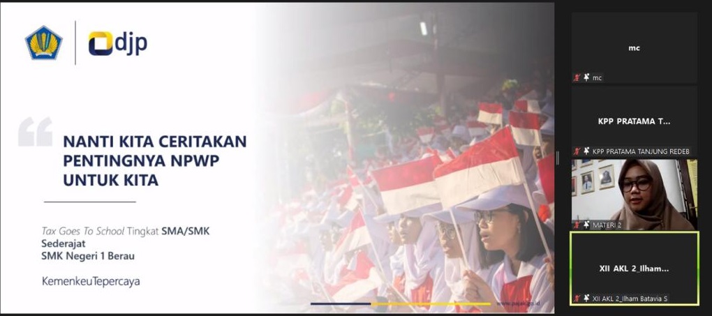 Sekolah Menengah Kejuruan Negeri (SMKN) 1 Berau bergabung dalam kegiatan Tax Goes To School (TGTS) bertajuk “Nanti Aku Ceritakan Pentingnya NPWP untuk Kita” yang diselenggarakan oleh Kantor Pelayanan Pajak (KPP) Pratama Tanjung Redeb secaradaring di Kota Tarakan (Kamis, 21/10).
