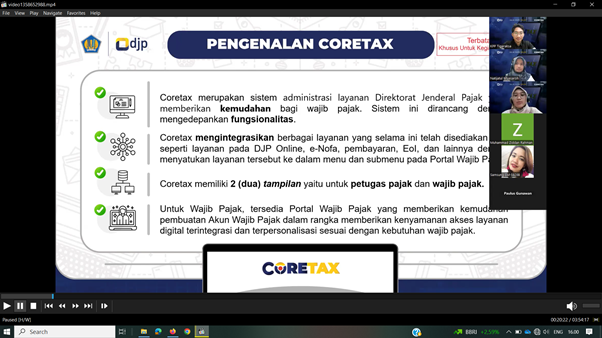 Kantor Pelayanan Pajak (KPP) Pratama Tigaraksa kembali mengadakan kelas pajak terkait pengenalan Coretax kepada wajib pajak. Berbeda dari edukasi Coretax sebelumnya, pada kesempatan kali ini KPP Pratama Tigaraksa menyelenggarakan kelas pajak secara daring melalui Zoom Meeting di Kabupaten Tangerang (Selasa, 3/12).