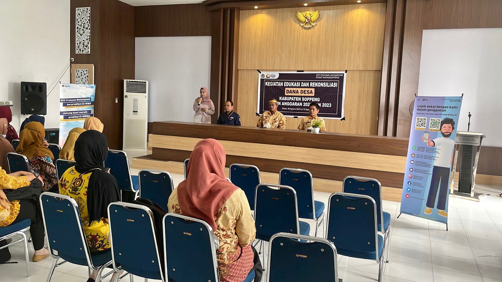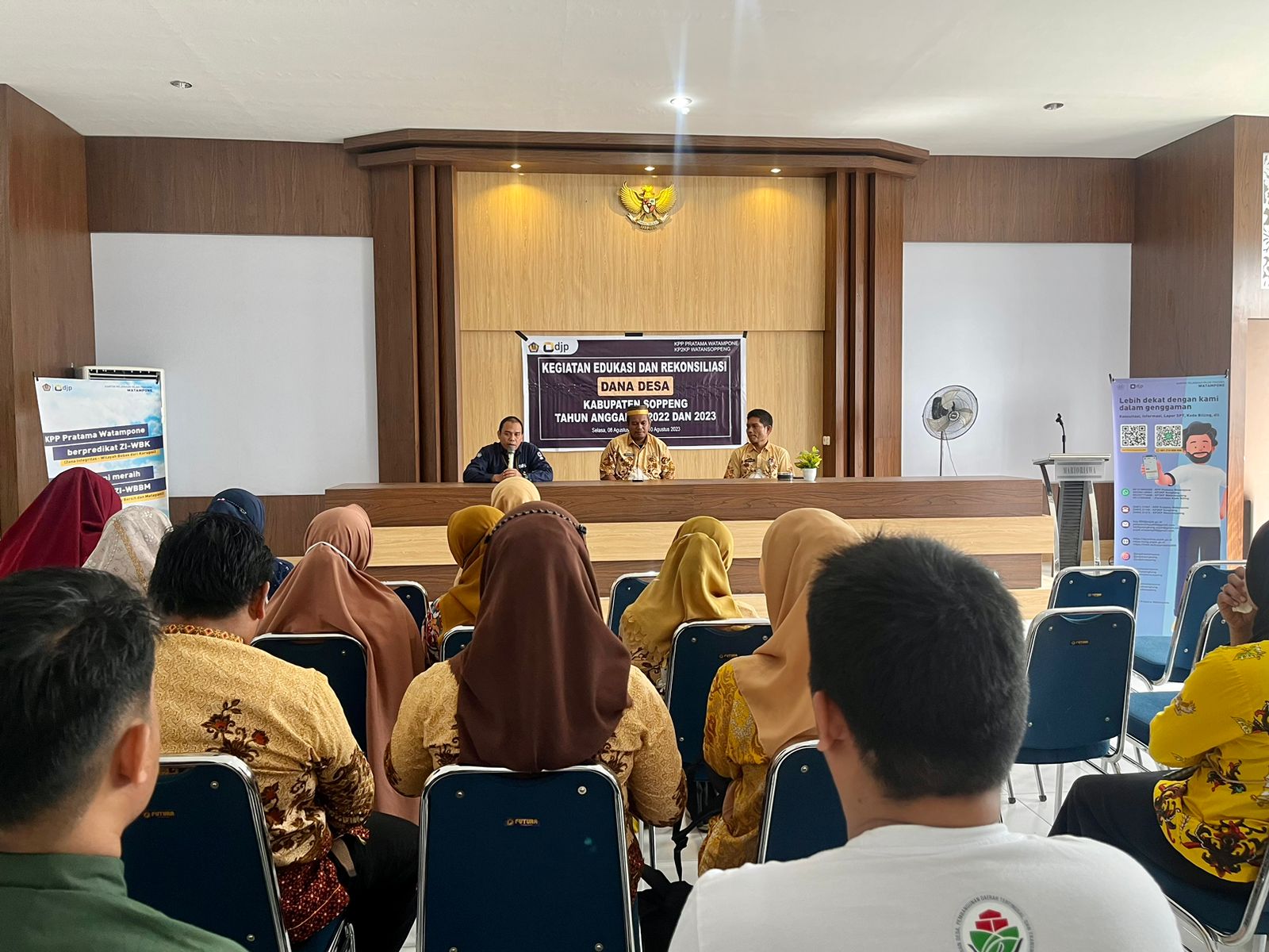 Kantor Pelayanan, Penyuluhan, dan Konsultasi Perpajakan (KP2KP) Watansoppeng bersinergi dengan Dinas Pemberdayaan Masyarakat Desa (PMD) melakukan kegiatan Edukasi dan Rekonsiliasi Perpajakan Dana Desa Tahun Anggaran 2022 dan 2023 di Aula Kecamatan Marioriwawo (Kamis,16/8).