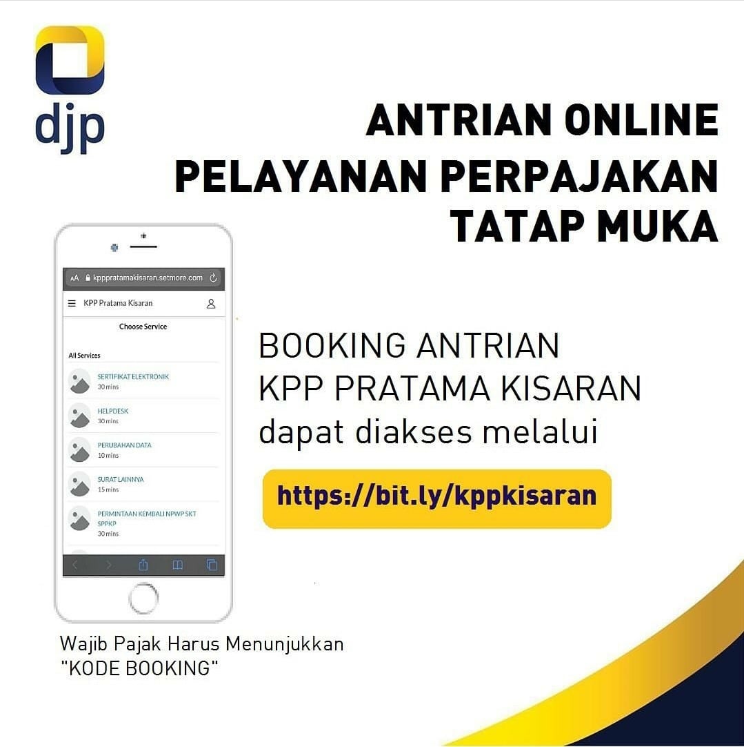 Untuk menggunakan antrean daring ini, wajib pajak cukup mengakses https://bit.ly/kppkisaran dan memilih layanan pajak yang dibutuhkan. Selanjutnya, jadwal pertemuan akan masuk ke email wajib pajak. Wajib pajak dapat hadir ke kantor pajak sesuai waktu pertemuan yang diinformasikan.