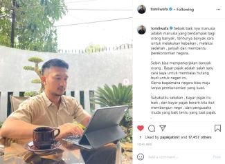 “Sahabatku sekalian, bayar pajak itu baik dan bayar pajak berarti kita ikut membangun negeri, dan pengusaha muda yang baik tentu yang taat pajak. Bayar dan lapor pajak bisa dilakukan di mana pun dan kapan aja. Di rumah, cafe, atau di warkop. Gampang buka aja di pajak.go.id,” tulisnya melalui caption Instagram.