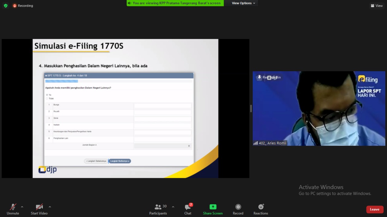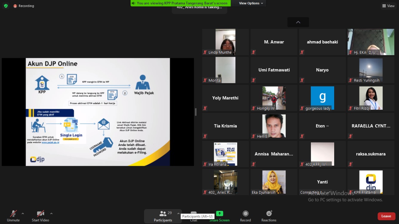Kelas pajak dilaksanakan melalui aplikasi Zoom Meeting dengan narasumber Account Representative KPP Pratama Tangerang Barat Yuhibbul Muttaqin dan Chris Mulio J. “Jumlah peserta kelas pajak yang berstatus sebagai karyawan semakin banyak dan tambah antusias,” ujar Yuhibbul Muttaqin.