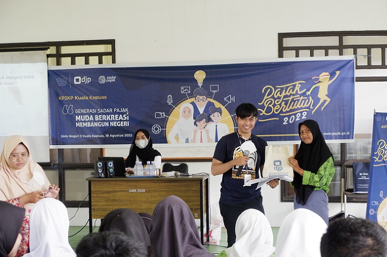 Kantor Pajak Kuala Kapuas mengajak para siswa SMA Negeri 3 Kuala Kapuas untuk menjadi generasi sadar pajak dan berkreasi membangun negeri dalam rangkaian kegiatan Pajak Bertutur 2022. Kegiatan yang dilaksanakan pada Kamis, 18 Agustus 2022 di ruang laboratorium SMA Negeri 3 Kuala Kapuas, Jalan Pemuda 5,5 Km No.36, diikuti oleh perwakilan siswa dari kelas X, XI, dan XII sejumlah 35 peserta.