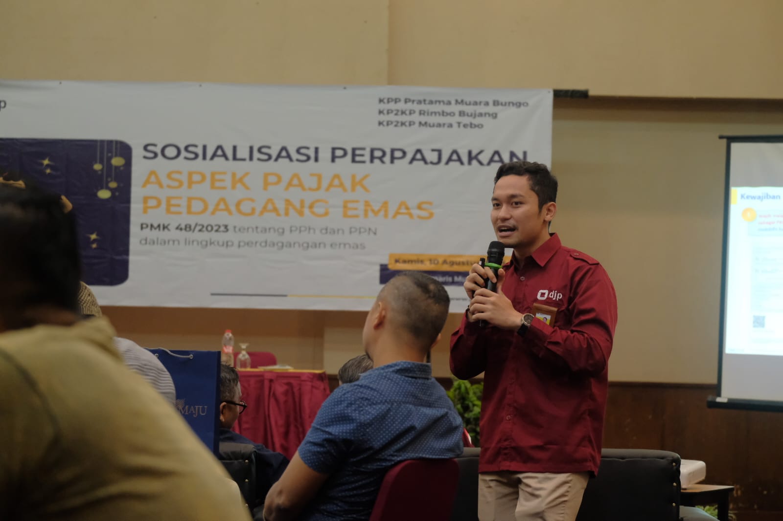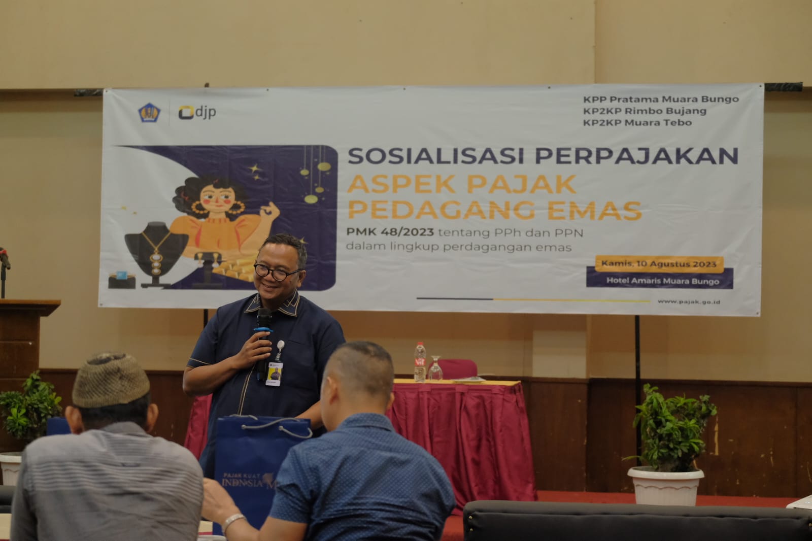 KPP Pratama Muara Bungo bekerja sama dengan KP2KP Rimbo Bujang dan KP2KP Muara Tebo dalam menyelenggarakan sosialisasi PMK-48 Tahun 2023 kepada pedagang emas yang berasal dari suku Minang di Aula Hotel Amaris Bungo, Muara Bungo (Kamis,10/8).