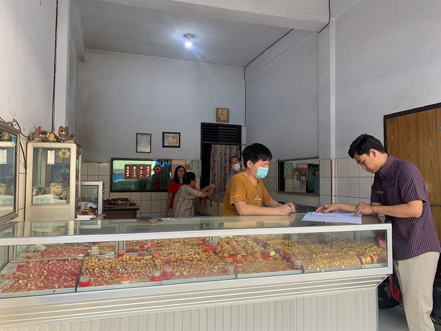 Pelaksana Kantor Pelayanan, Penyuluhan, dan Konsultasi (KP2KP) Pinrang memberikan edukasi kepada wajib pajak pedagang emas perhiasan di Jalan Melati, Kecamatan Watang Sawitto, Kabupaten Pinrang (Selasa, 7/5). Edukasi yang diberikan terkait kewajiban pedagang emas perhiasan untuk dikukuhkan sebagai Pengusaha Kena Pajak (PKP).